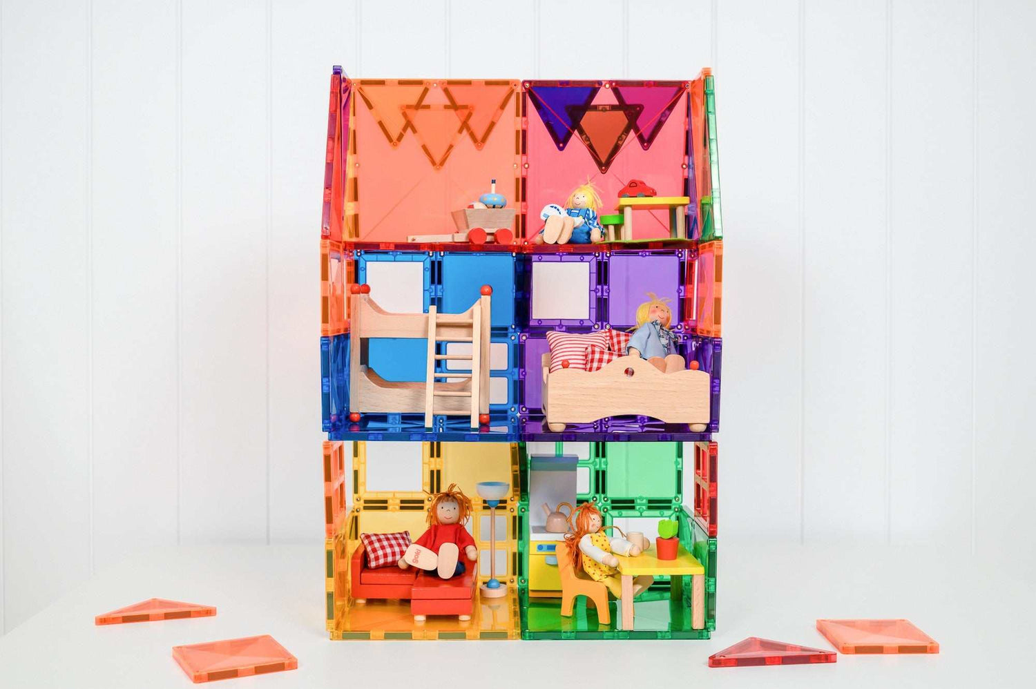 Inhalt: 60 Teile, 4 große Quadrate, 24 kleine Quadrate, 12 gleichseitige Dreiecke, 8 rechtwinklige Dreiecke, 6 gleichschenklige Dreiecke, 4 Fensterteile, 4 Türstücke, Ideenheft, eine praktische Tasche.