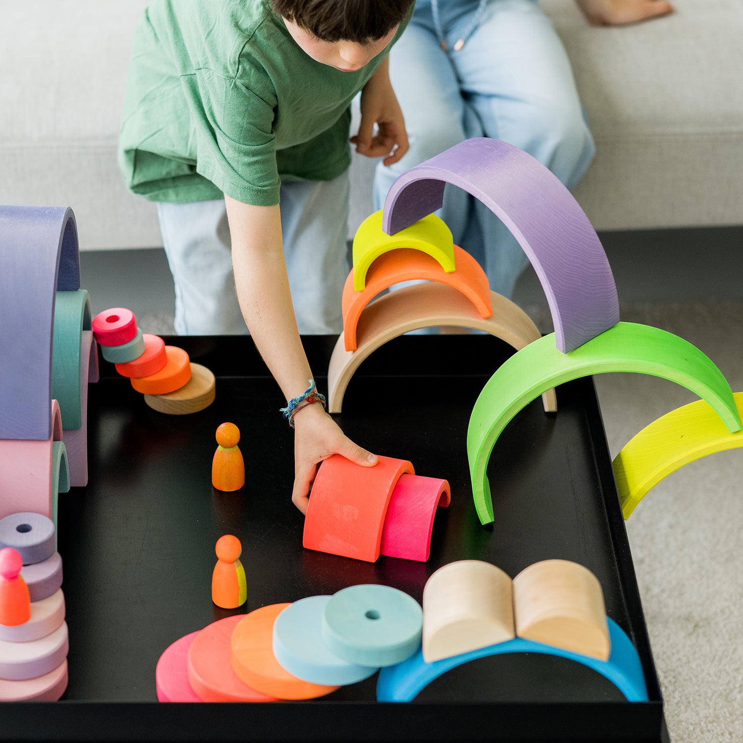 Dieses vielseitige Spielzeug lädt Kinder zum Stapeln, Bauen, Sortieren und kreativen Spielen ein, während es gleichzeitig ein faszinierendes Interieur-Highlight für Erwachsene darstellt.