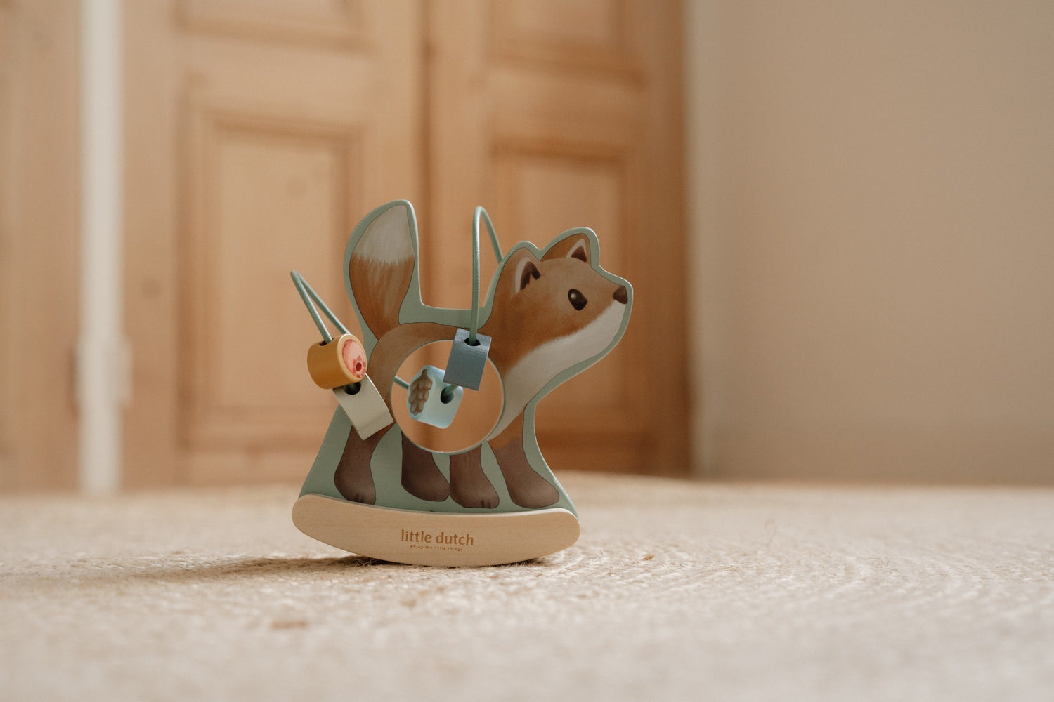 Lass die Perlen um den hölzernen Fuchs kreisen, während er hin und her schaukelt.