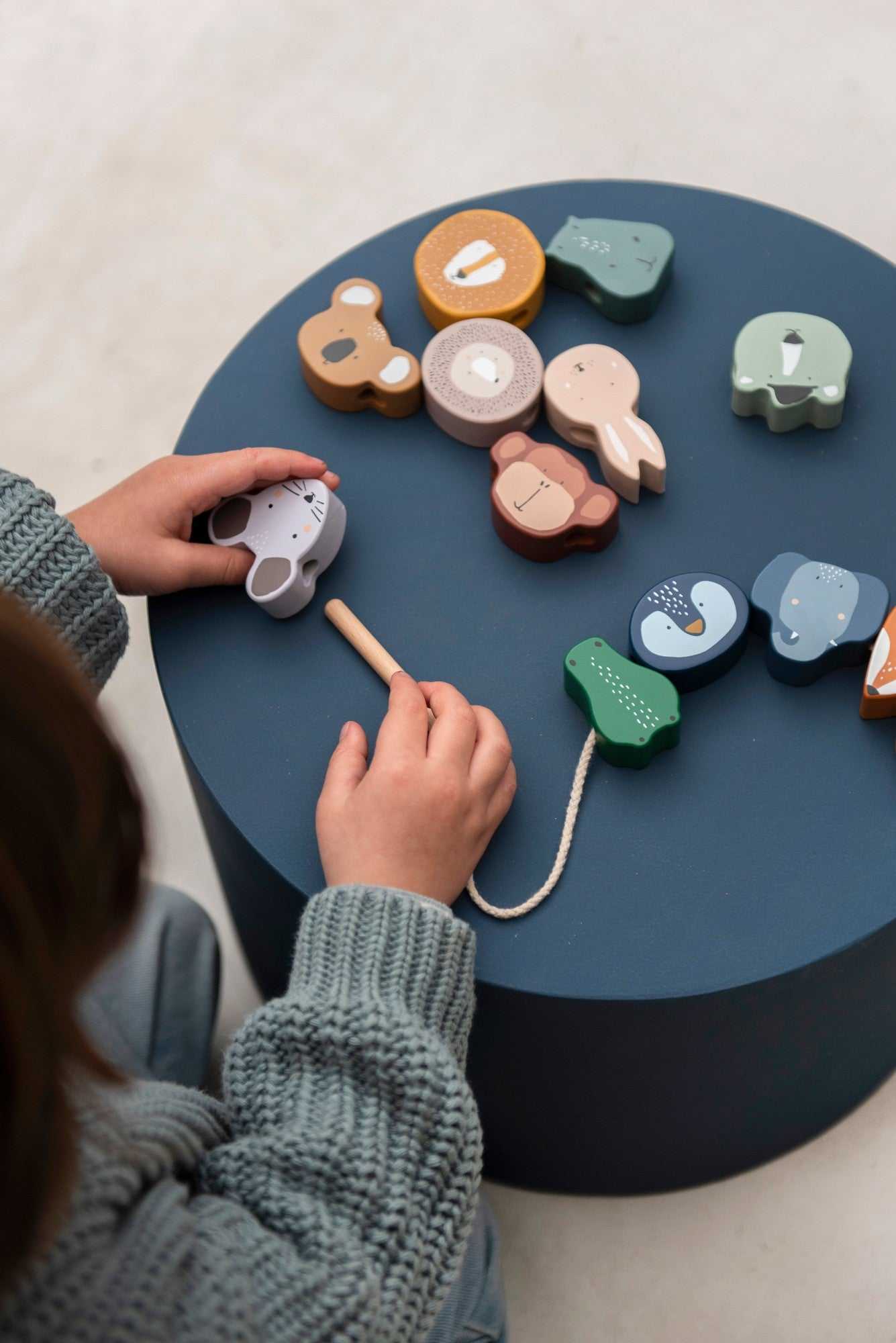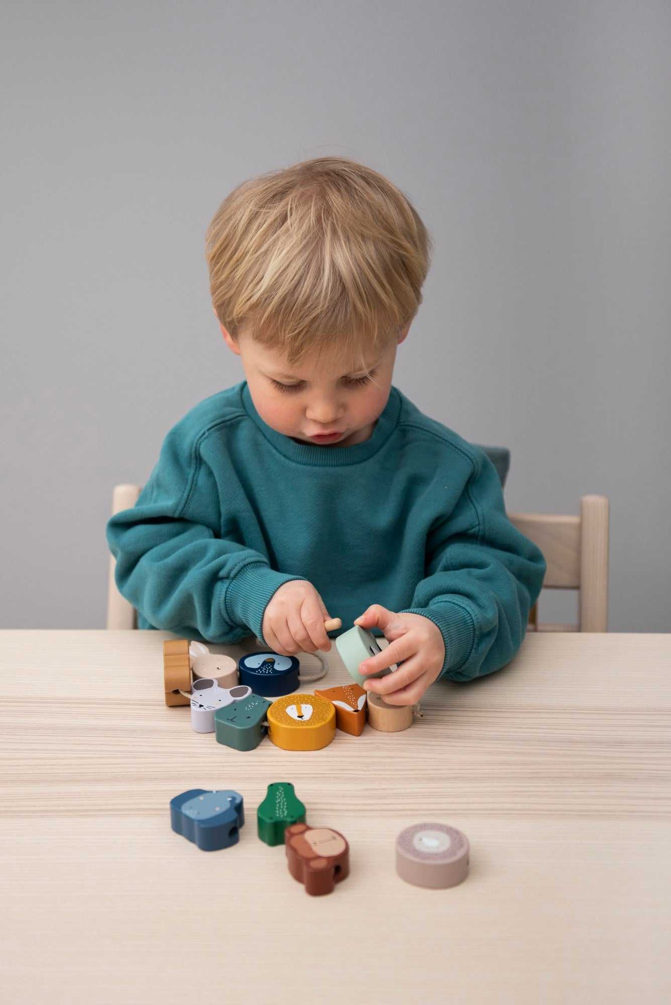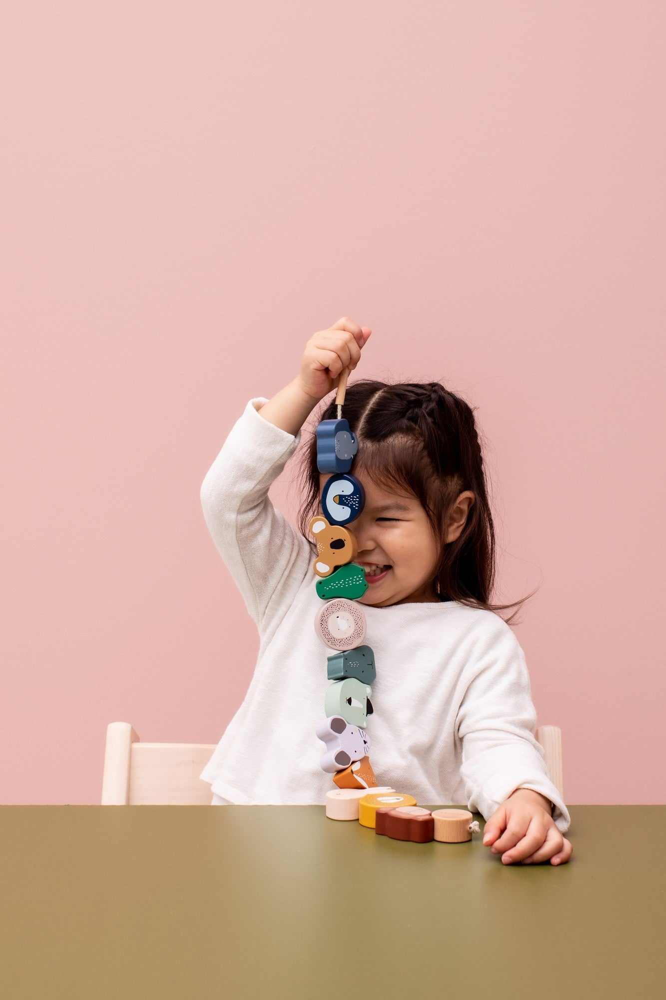 Die Tierperlen aus Holz von Trixie Baby sind eine großartige Möglichkeit, die motorischen Fähigkeiten kleiner Kinder ab 2 Jahren zu fördern. Mit diesen Perlen können sie spielerisch komplexe und präzise Bewegungen mit ihren Händen üben, indem sie die Holztiere auf die Schnur fädeln. Das ist nicht nur eine unterhaltsame Aktivität, sondern auch eine hervorragende Methode, um die Feinmotorik der Kinder zu trainieren. Diese Schnürperlen bestehen zu 100 % aus zertifiziertem Holz, was bedeutet, dass sie aus nachhaltiger Forstwirtschaft stammen und umweltfreundlich sind. Außerdem sind alle auf diesem Produkt verwendeten Farben wasserbasiert, sicher für Kinder und ungiftig, sodass Eltern sich keine Sorgen um die Gesundheit ihres Kindes machen müssen. Mit den Tierperlen von Trixie Baby können Kinder nicht nur ihre Geschicklichkeit entwickeln, sondern auch ihre kreativen Fähigkeiten fördern, indem sie verschiedene Tiermuster erstellen. Dieses Spielzeug bietet somit nicht nur pädagogischen Wert, sondern auch stundenlangen Spielspaß. Modell: 36-805 Maße: 20 x 12,5 x 5 cm Altersempfehlung: ab 2 Jahre Material: MDF – Buchenholz Lieferumfang: 14 Teile, Maus, Koala, Hase, Krokodil, Löwe, Igel, Elefant, Bär, Pinguin, Affe, Nilpferd, Fuchs und Schnur.