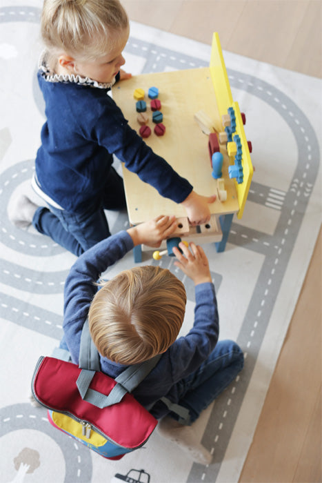 In der Kinderwerkstatt ist was los! Mit dieser kompakten Werkbank kann auf kleiner Spielfläche beim Hämmern, Sägen und Schrauben im Rollenspiel handwerkliches Geschick erprobt werden. Realitätsnahe Zubehörteile und Werkzeuge wie Hammer, Schraubenschlüssel, Schraubendreher, Schraubstock und Säge fördern den Spielspaß und motivieren Kinder zum kreativen, fantasievollen Spiel. Eine Vielzahl unterschiedlicher Zubehörteile bestehend aus Schrauben, Muttern, Zahnrädern sowie einer Reihe von Unterlegscheiben und Lochleisten in verschiedenen Formen und Größen ermöglichen es, eigene kleine Bauprojekte zu verwirklichen oder mithilfe der mitgelieferten Anleitung ein Rennauto zu konstruieren. Löcher an Vorder- und Rückseite sowie auf der Arbeitsfläche können außerdem genutzt werden, um Zubehörteile und Werkstücke an der Werkbank fest zu schrauben. Beim Spielen und Tüfteln trainieren Kinder ihre Motorik sowie die Hand-Augen-Koordination und erlernen spielerisch den Umgang mit Werkzeugen sowie ein erstes technisches Grundverständnis.