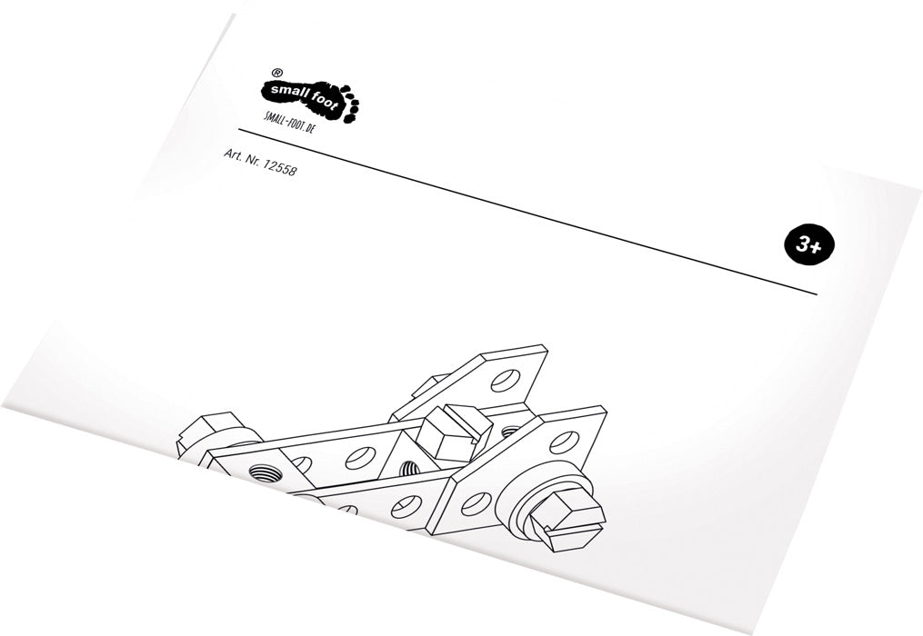 Inhalt: 1 Werkbank, 1 Hammer, 1 Schraubenschlüssel, 1 Schraubendreher, 1 Säge, 2 große Lochleisten, 1 mittlere Lochleiste, 2 kleine Lochleisten, 2 diamantförmige Lochleisten, 2 viereckige Lochleisten, 9 Schrauben, 3 Nägel, 6 Muttern, 3 Zahnräder, 2 dünne Unterlegscheiben, 4 dicke Unterlegscheiben, 1 Vorderzange
