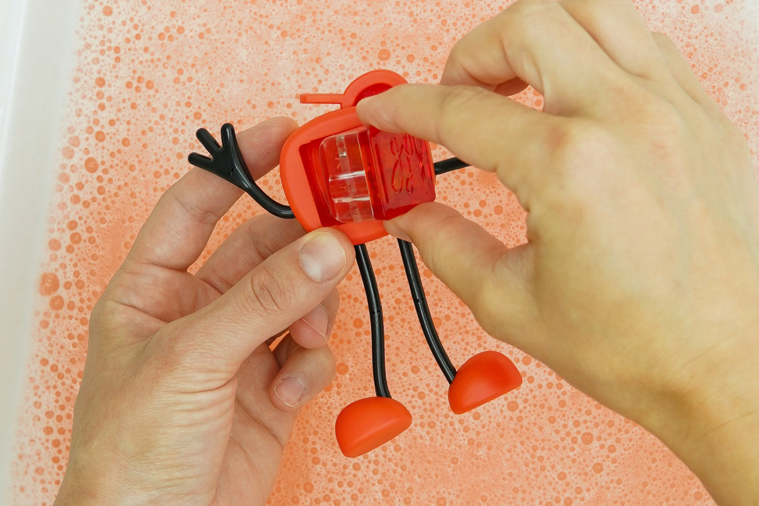 Die Glo Pals sind einfach zu pflegen. Nach dem Gebrauch spülen Sie sie einfach mit klarem Wasser ab, schütteln sie und pusten durch die kleinen Schlitze an der Seite, um die wenigen im Würfel verbliebenen Tropfen zu entfernen, und lassen sie an der Luft trocknen.
