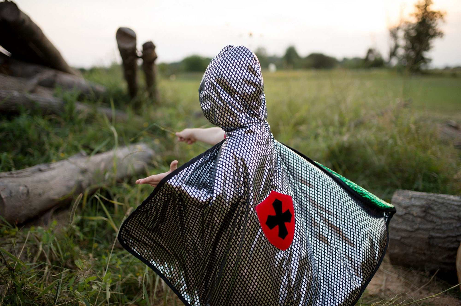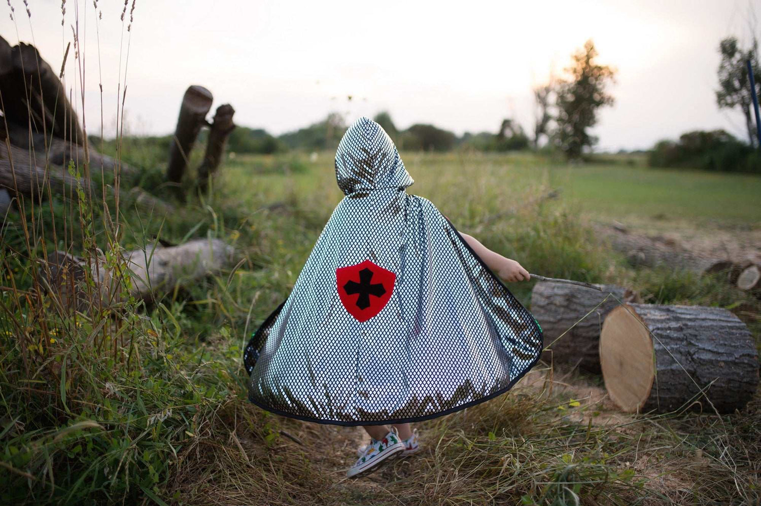 Mit diesem Wendecape kann Ihr Kind entweder ein Drache oder ein Ritter sein.