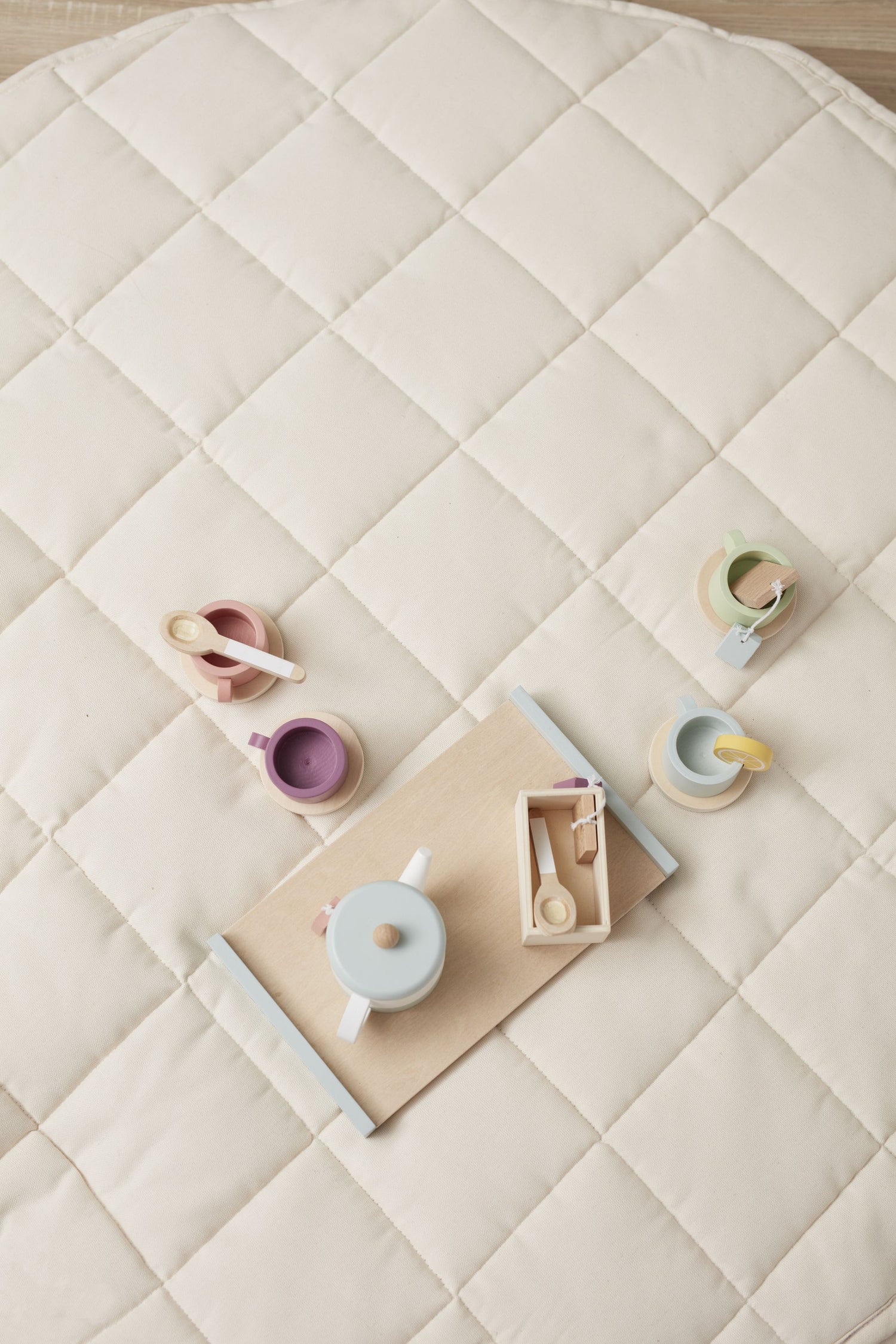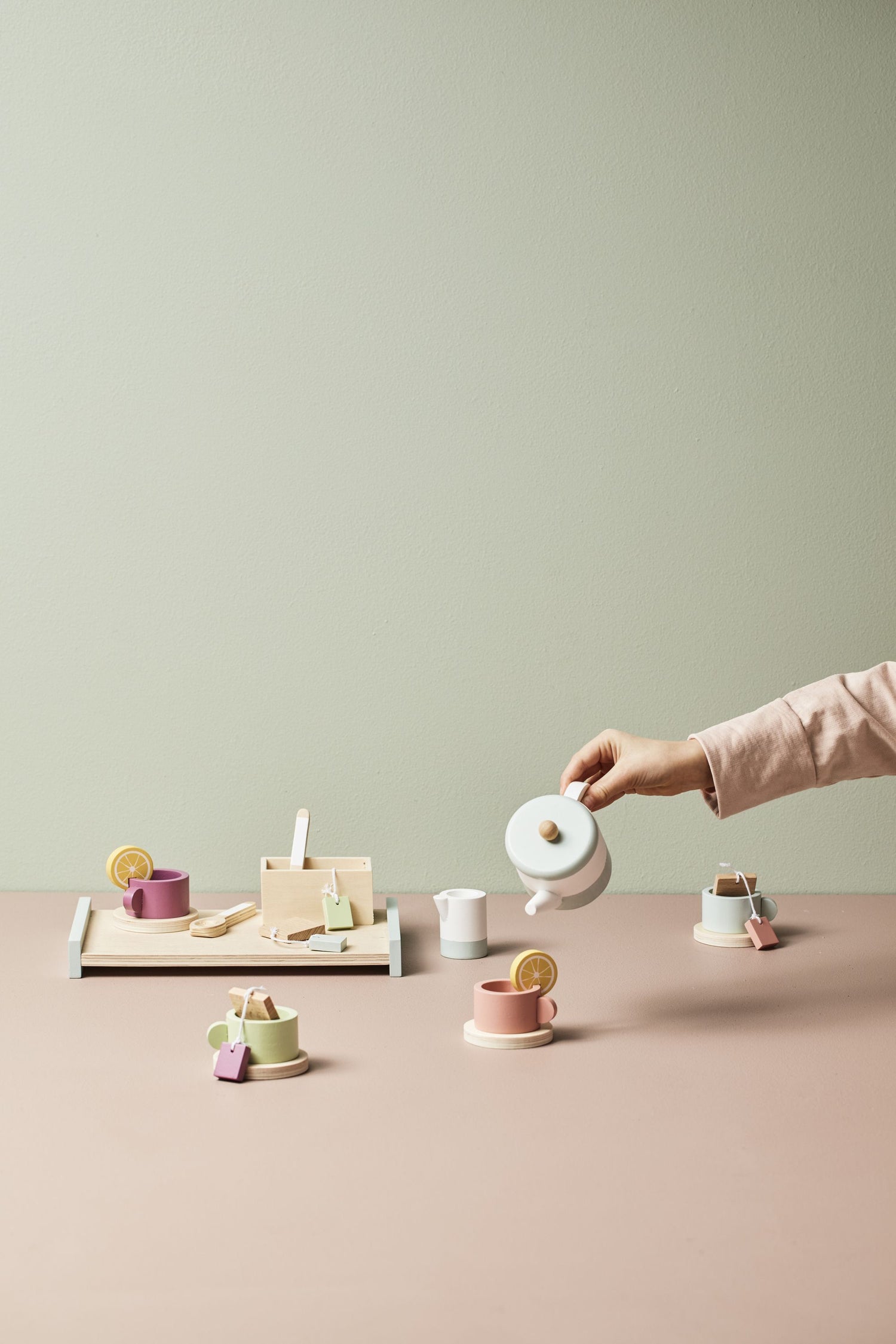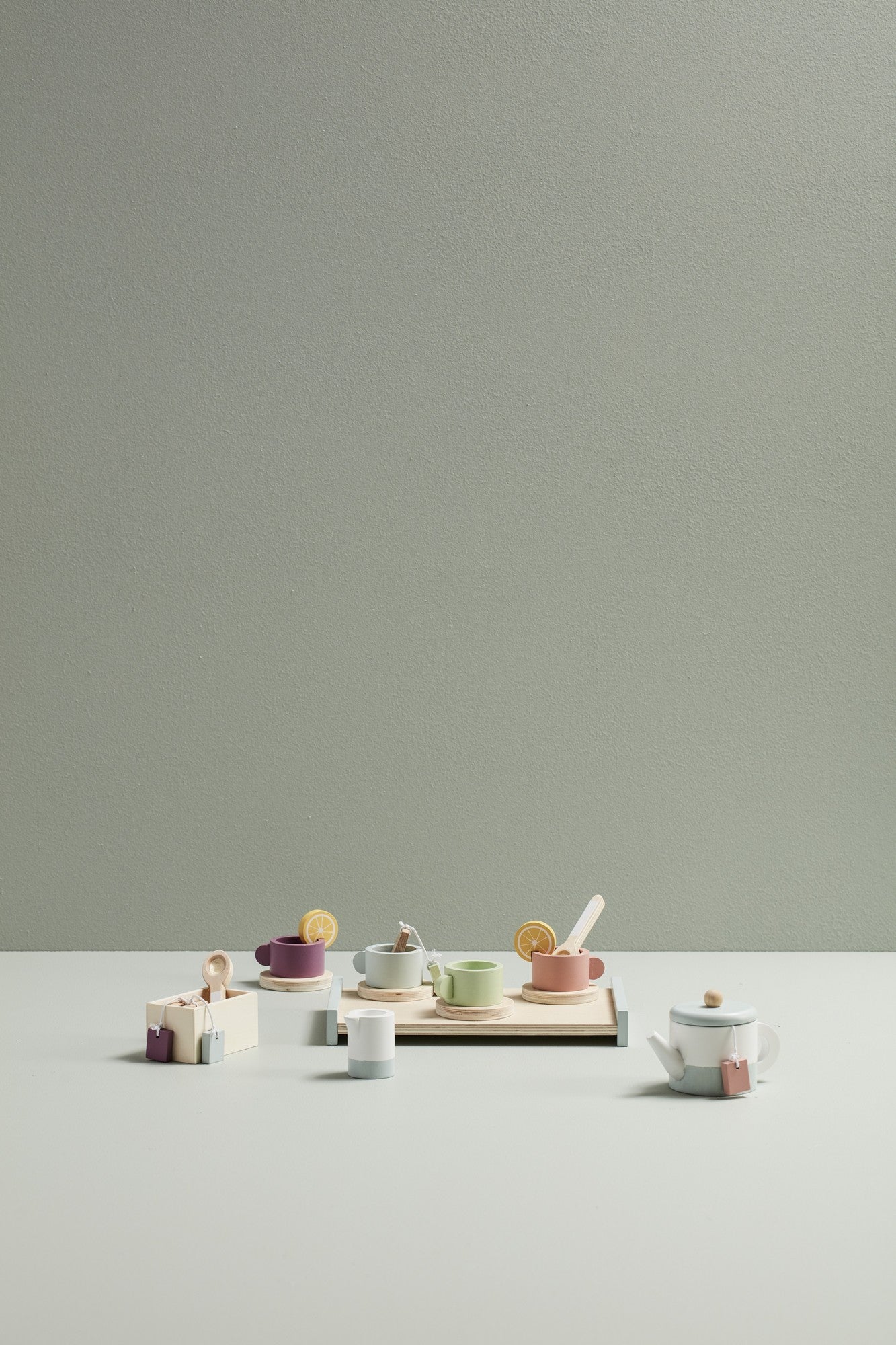 Ein schönes Tee-Set von Kids Concept. Mit diesem tollen Set kann Dein Kind seine Freunde oder die Lieblingspuppe zu einer Teeparty im Kinderzimmer einladen. Es kann zwischen vier verschiedenen Teesorten gewählt, die Zitronenscheibe am Becherrand befestigt und ein Schuss Milch in die Tasse gegossen werden. Wenn alles nach Wunsch zubereitet ist kann der Tee auf dem Tablett serviert werden. Das Set besteht aus 21 Teilen: eine Teekanne mit Deckel, vier Tassen mit Untertassen, vier verschiedene Teebeutel, zwei Zitronenscheiben, eine Aufbewahrungskiste für die Teebeutel, zwei Teelöffel, ein Tablett und eine Aufbewahrungsbox für das komplette Set.