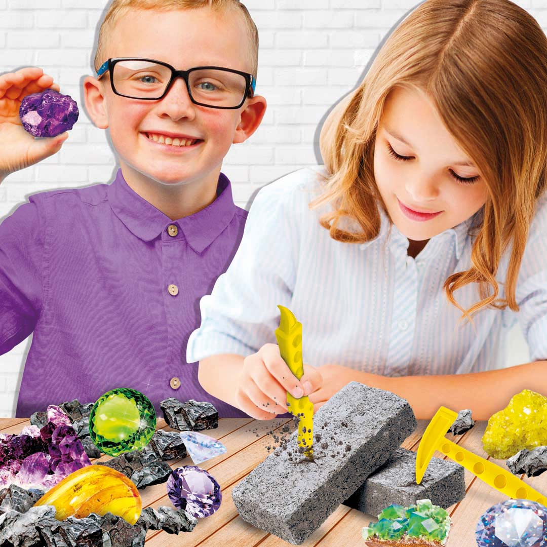 Mit Hammer, Meißel und Neugier holst du echte Edelsteine wie roten Jaspis, Aventurin, Quarz und Rosenquarz aus einer Gipsgrube. Anschließend kannst du deine Schätze unter die Lupe nehmen, spannende Details zu ihren Eigenschaften entdecken und deine eigene Mineraliensammlung starten.