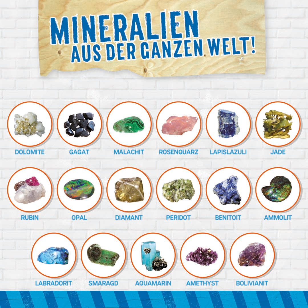 Inhalt: Edelsteingrube, echte Edelsteine (u. a. roter Jaspis, Aventurin, Quarz, Rosenquarz), Ausgrabungswerkzeug, Bestimmungsposter, Lupe, bebilderte Anleitung