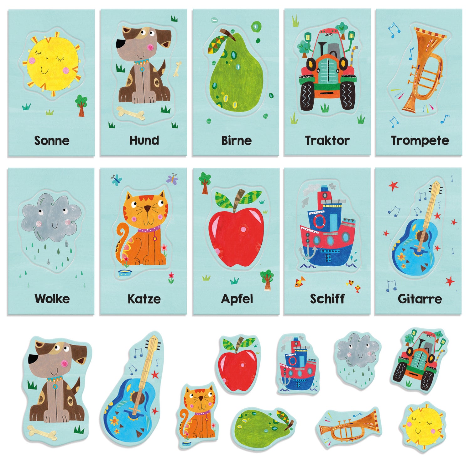 Mit speziellen Formen zum Einsetzen aktivieren diese Bildkarten verschiedene Wahrnehmungswege.