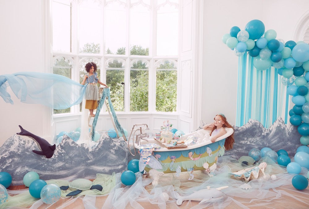 Dieses hübsche blaue Ballon und Luftschlangen Set von Meri Meri macht jede Feier zu etwas ganz besonderem und sieht besonders auf einer Geburtstagsfeier oder einer Babyparty eines Jungen super aus. Das Set besteht aus 52 Luftballons, davon sind 6 groß und 46 klein. Der Papier-Streamer ist an einer Goldkordel vor gefädelt. Die Papierluftschlangen bestehen aus 25 Luftschlangen in hellblauem, mintfarbenem und blauem Krepppapier, was die Besonderheit in diesem Set darstellt. Es ist einfach zu montieren und eignet sich für Kinder ab 8 Jahren. Die Verpackung dieses Luftschlangensets ist aus umweltfreundlichem Papier.
