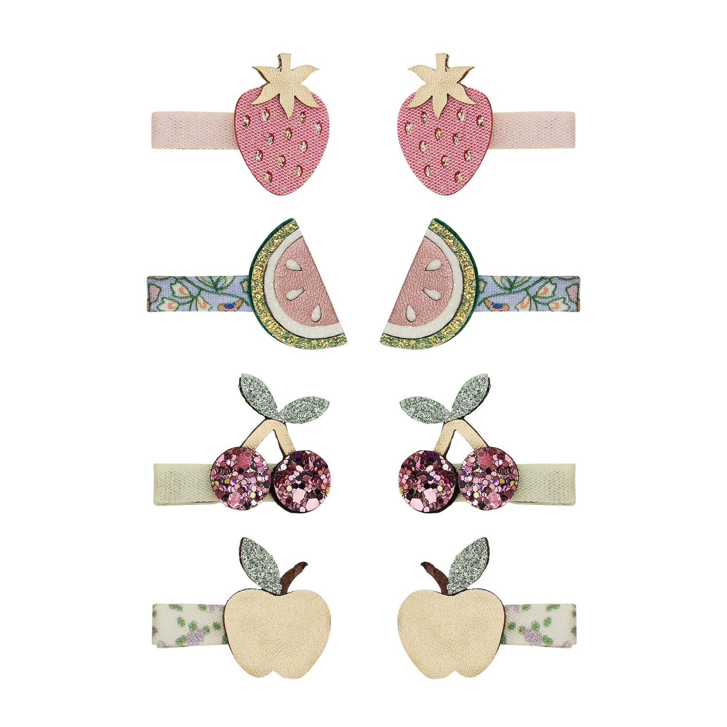 Mit den Fruit Salad Mini Clips von Mimi & Lula zieht eine ordentliche Portion „peel-good“-Laune ins Haar ein. Zarte Pastelltöne treffen auf florale Stoffe, während kleine, liebevoll gestaltete Früchte aus Glitzer- und Metallic-Materialien für funkelnde Akzente sorgen. Ob einzeln getragen oder kunterbunt kombiniert – dieses Set bringt Farbe, Leichtigkeit und eine verspielte Note in jede Frisur. Die Mini-Clips sind perfekt für feines Haar geeignet und setzen dezente, aber wirkungsvolle Highlights. Ein fruchtiger Styling-Moment, der einfach gute Stimmung macht – ganz im charmanten Stil von Mimi & Lula.