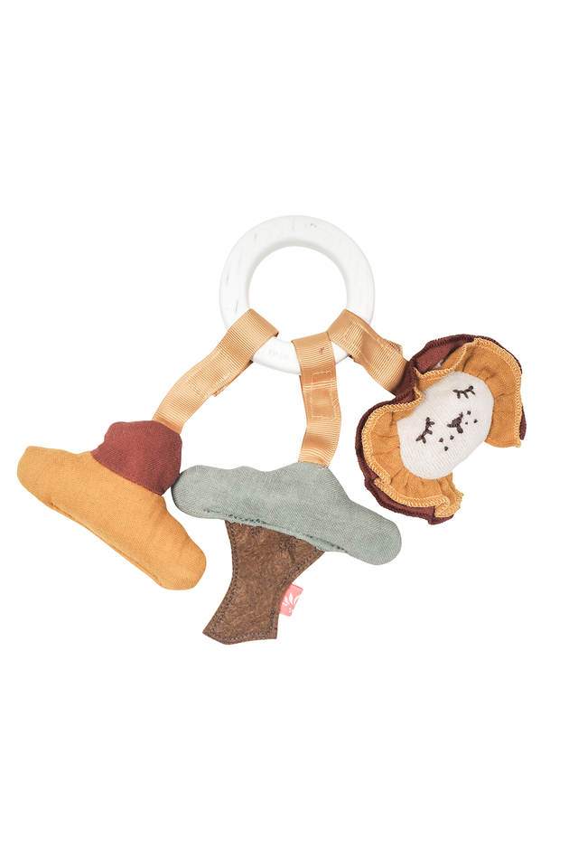 Der Ring aus 100% Natur- Kautschuk dient als Beißring und die drei abnehmbaren Mini Figuren eignen sich hervorragend als Ablenkung.