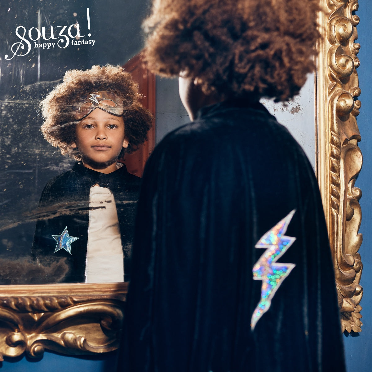 Der Umhang ist aus weichem Samt hergestellt und die holografischen Sterne und Blitze machen ihn zu einem besonderem Verkleidungstück.