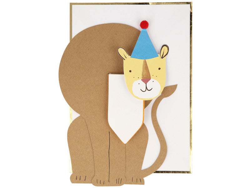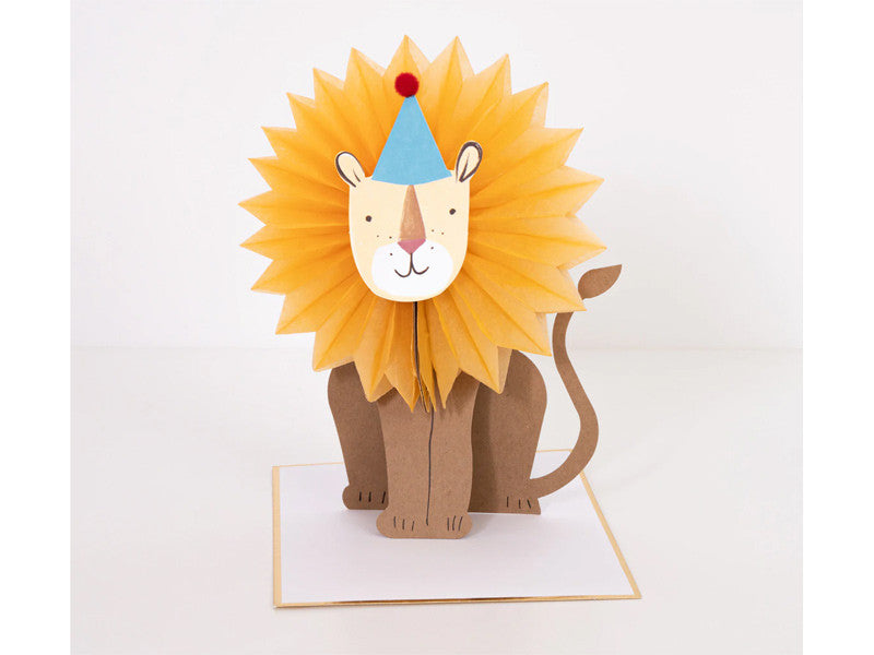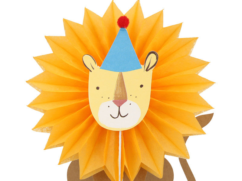 Diese bezaubernde 3D-Löwenkarte von Meri Meri ist der perfekte Weg, um dem Geburtstagskind die besten Wünsche zu senden. Der Löwe hat eine fabelhafte Wabenkrause aus Seidenpapier und einen lustigen Partyhut mit Bommel.