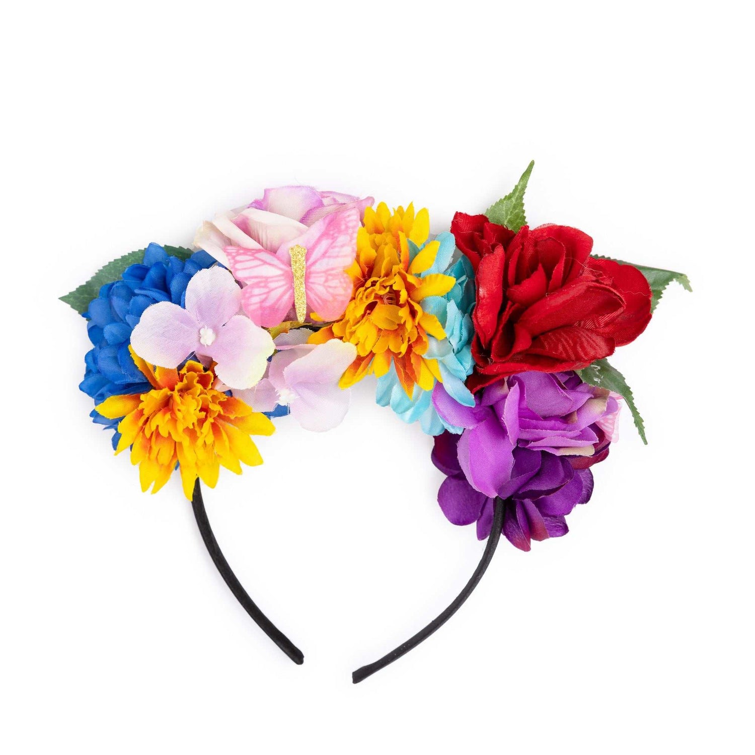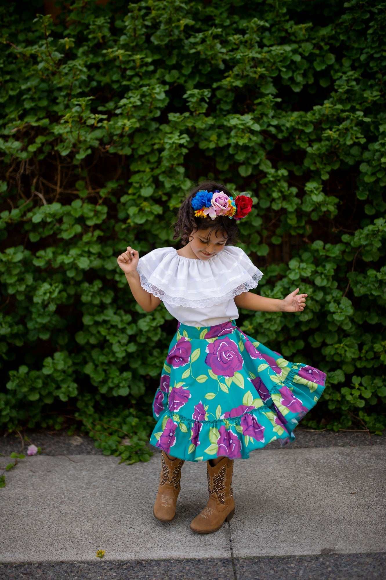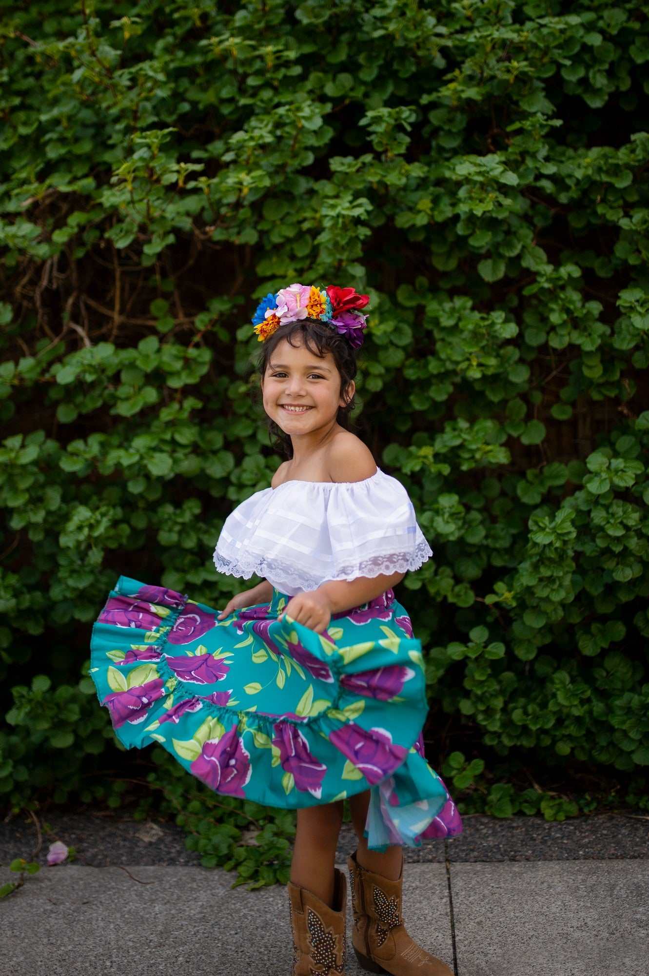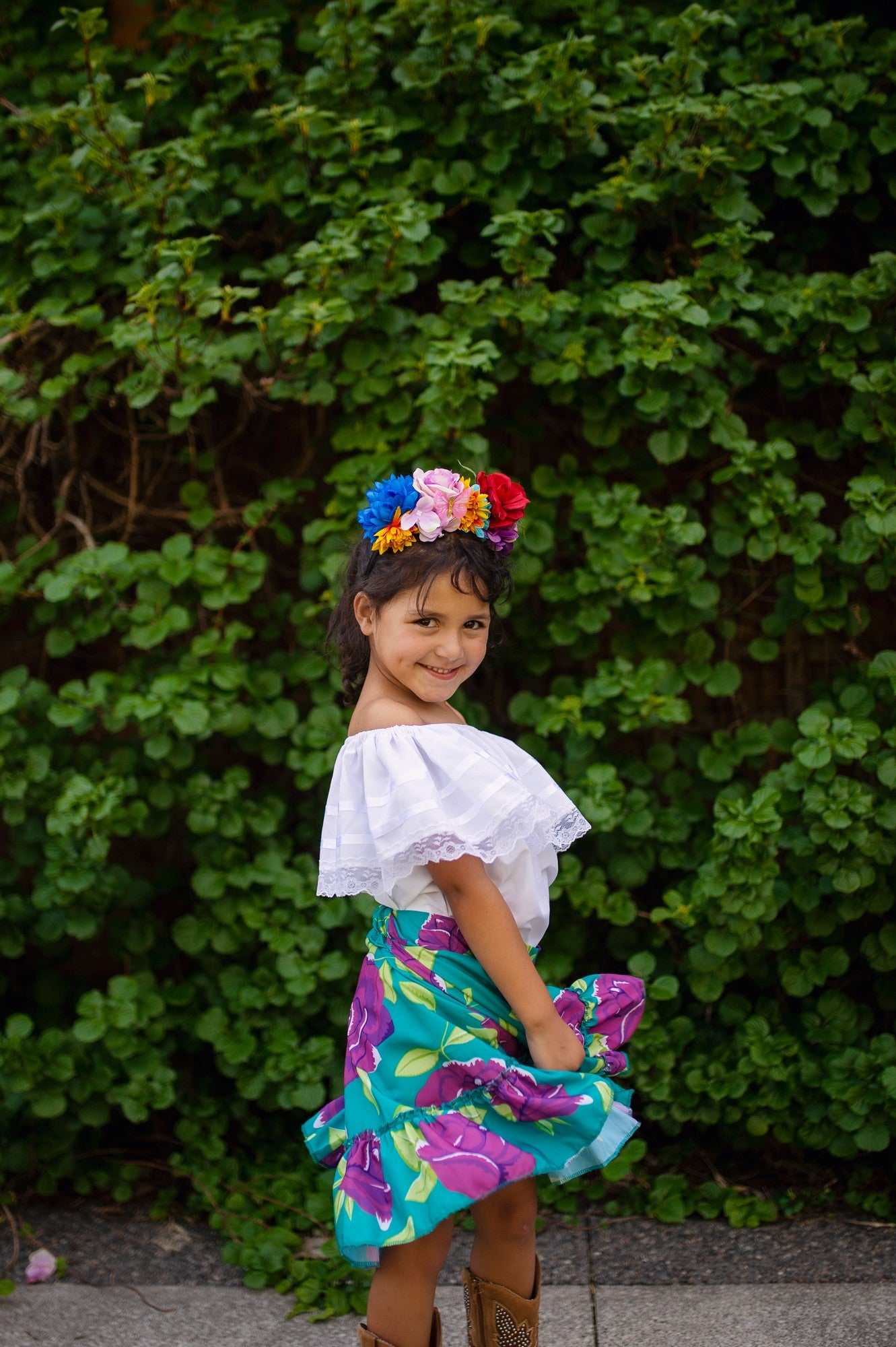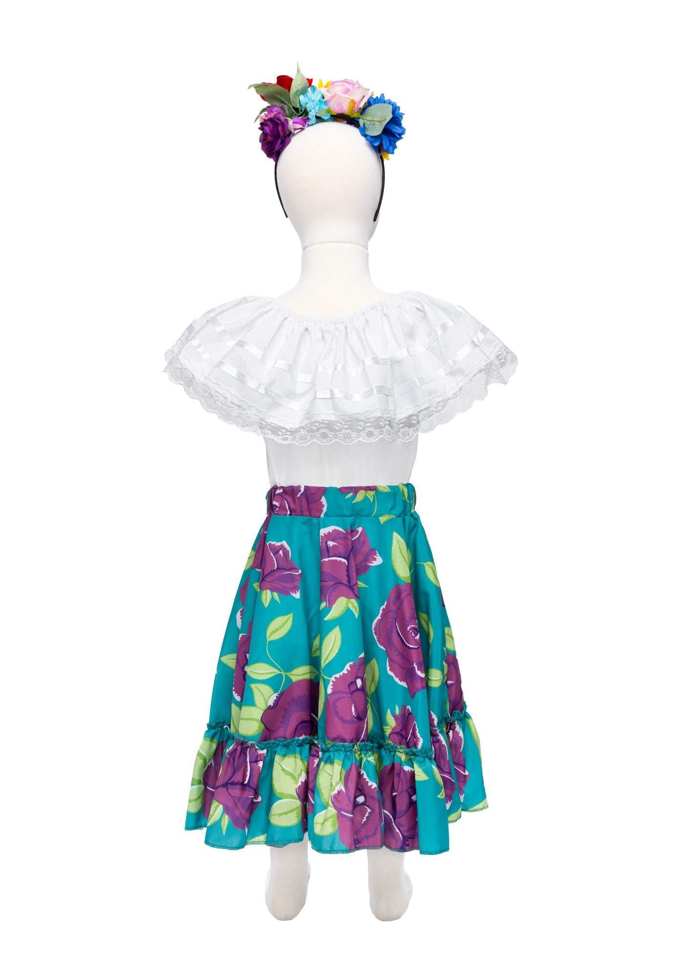 Dieses Set besteht aus einem Volant-Rock mit Blumenmuster, einer Schulterfreien Bluse und einem farbenfrohen, blumigen Kopfschmuck.