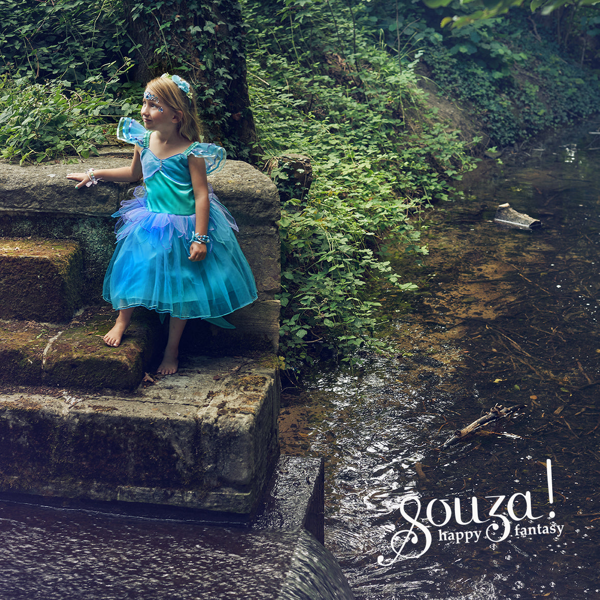 Das Kleid schimmert wie das Meer selbst und die Schwanzflosse macht das Kostüm zu einem besonderem Verkleidungsstück.