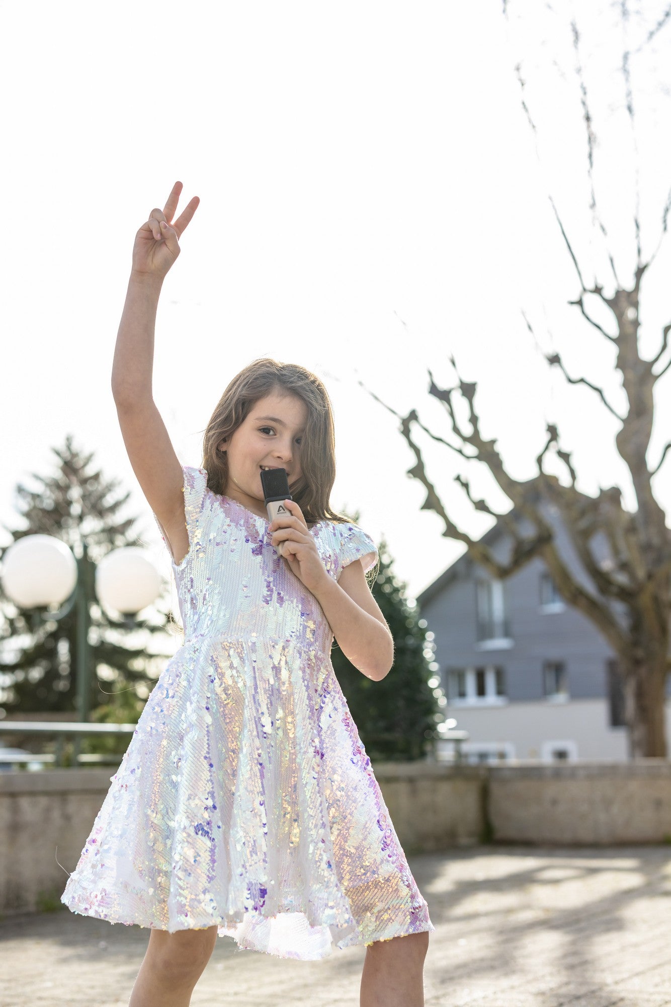 Bereit für einen strahlenden Auftritt wie ein echter Superstar? Das Paillettenkleid „Concert Queen“ ist die perfekte Wahl für alle Nachwuchstalente, die gerne im Rampenlicht stehen. Besetzt mit einer Mischung aus großen und kleinen, irisierenden Pailletten, leuchtet das Kleid auf den ersten Blick weiß, reflektiert aber bei jeder Bewegung sanfte Violett- und Regenbogenfarben – genau wie das funkelnde Licht einer Live-Performance.