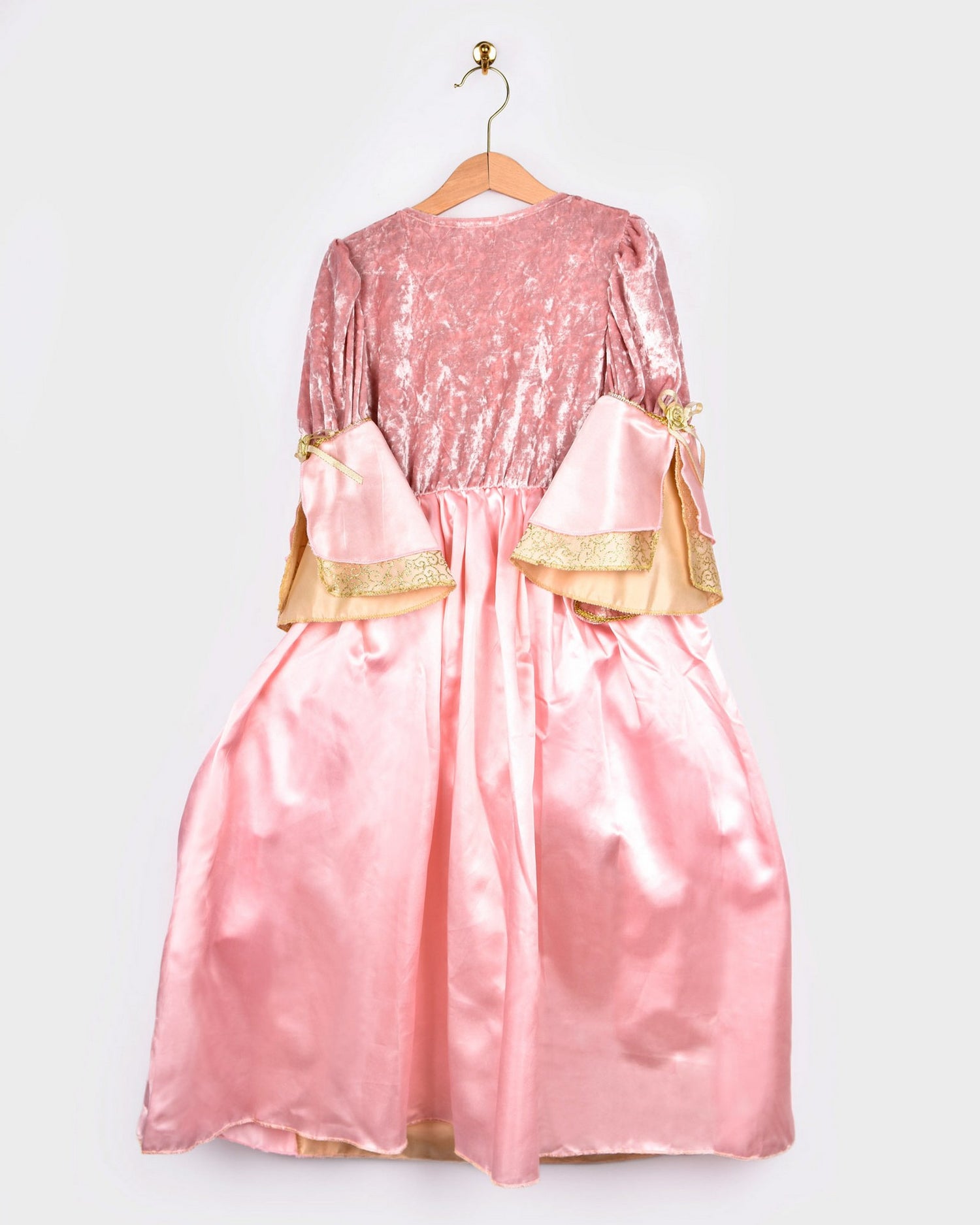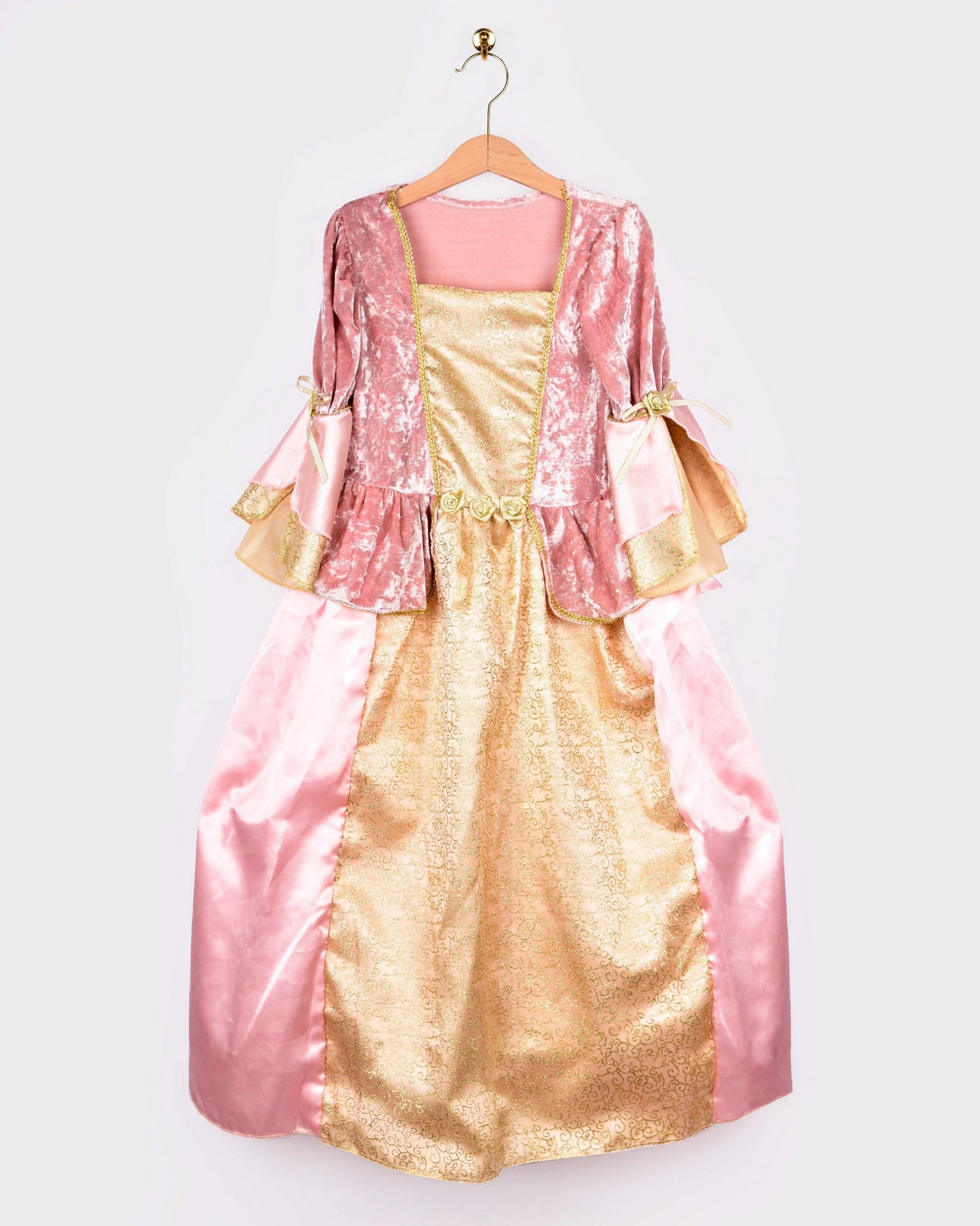 Das Kleid besticht durch sein edles Design in zarten Pastellfarben und ist mit goldenen Verzierungen versehen, die dem Kostüm einen königlichen Touch verleihen. Die weichen Samtstoffe sorgen für ein angenehmes Tragegefühl und lassen das Kostüm besonders hochwertig wirken.