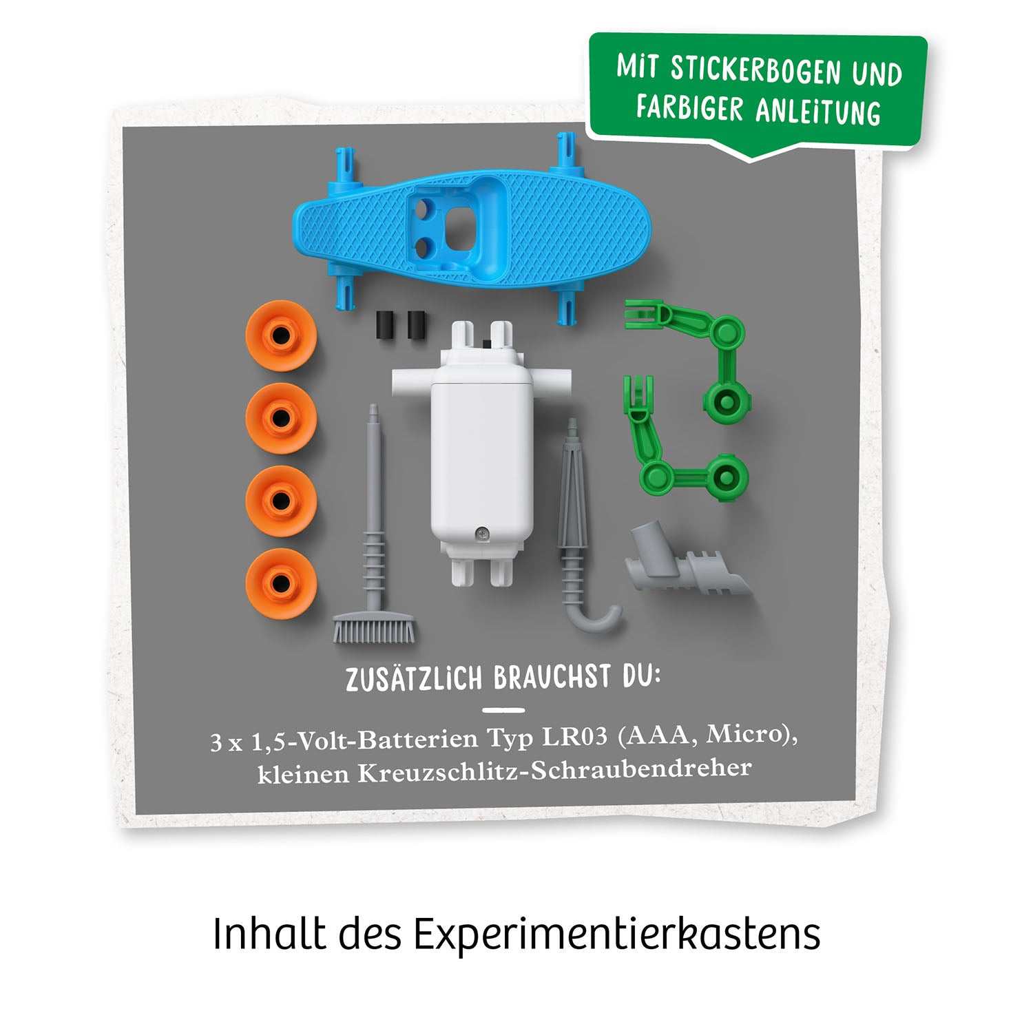 Aus wenigen Einzelteilen und mit schnellen Klicks bauen Kinder ab 8 Jahren einen rollenden Roboter von KOSMOS zusammen.