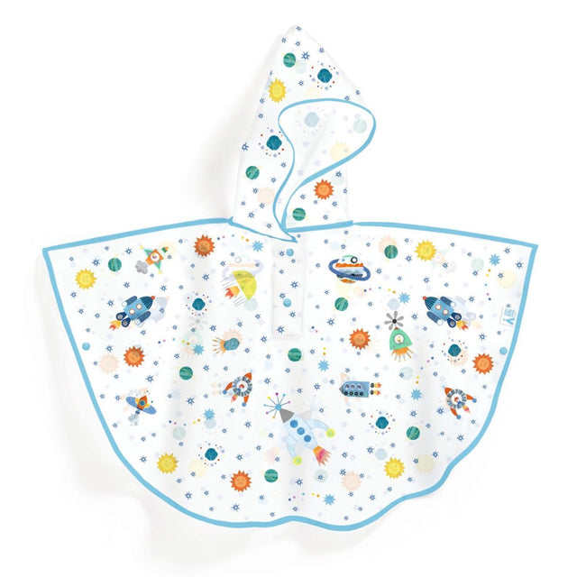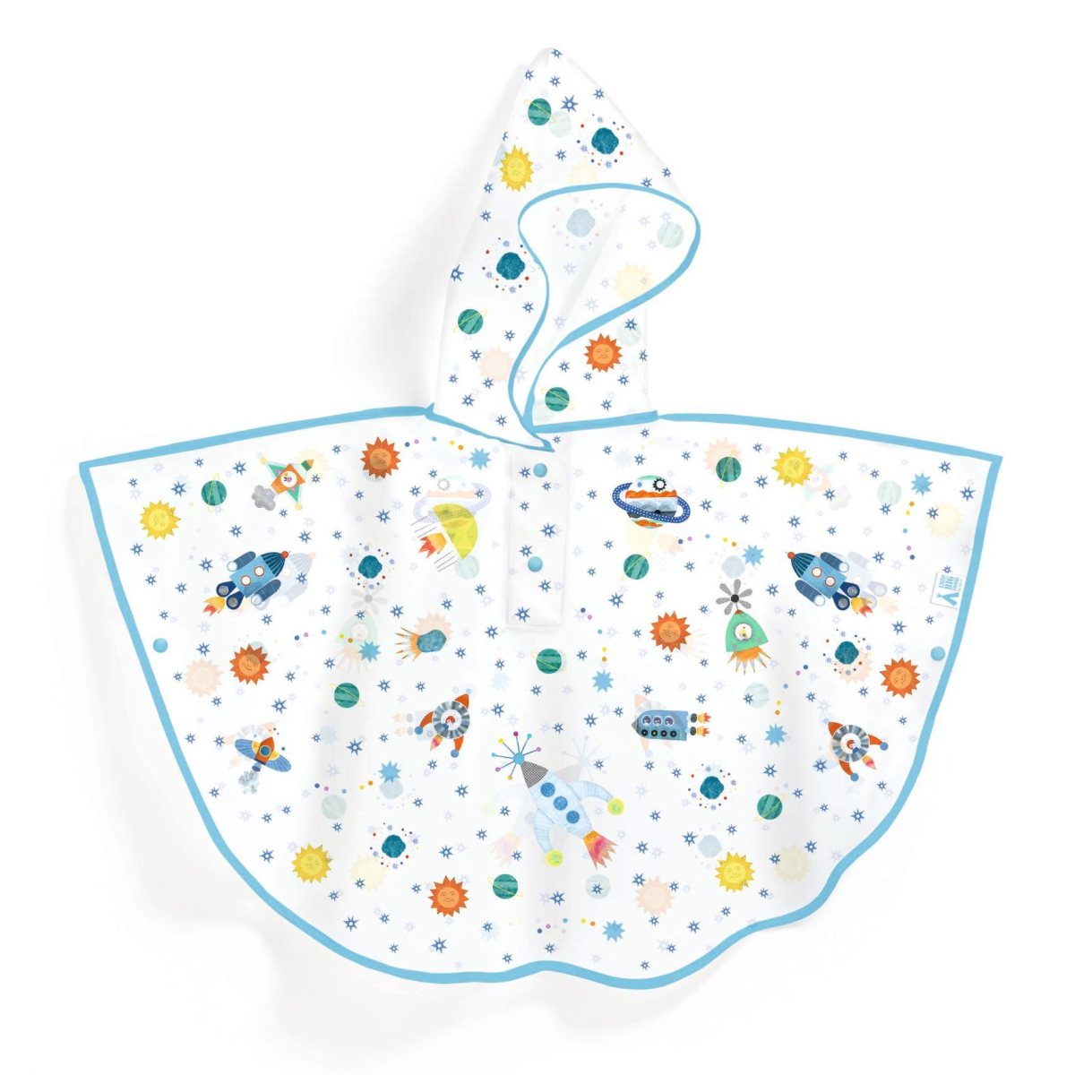 Ein schickes, praktisches Regencape in leuchtenden Farben mit Kapuze, mit Illustrationen zum Thema Weltraum von Djeco.
