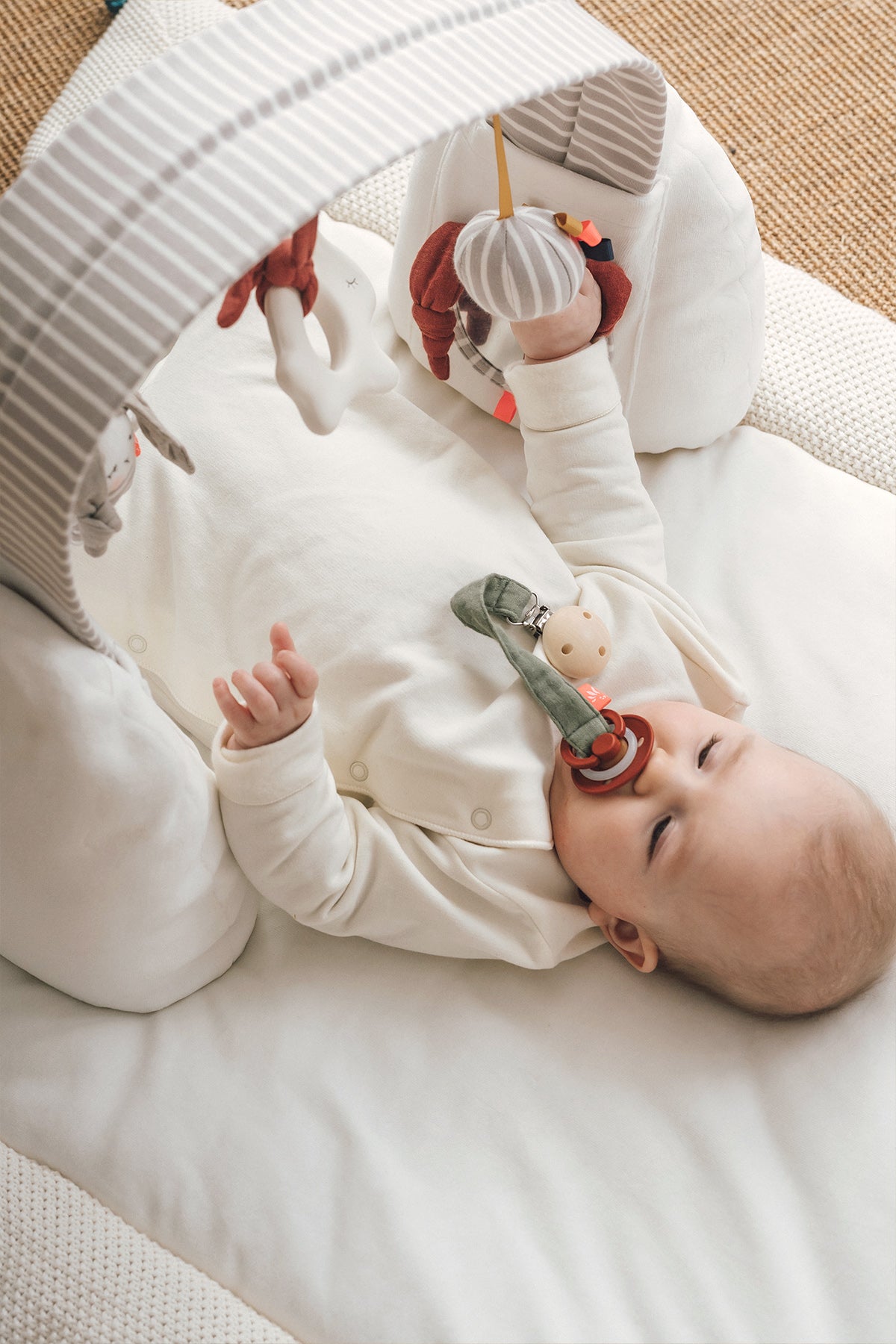 Dank der abnehmbaren und austauschbaren Spielfunktionen wie der Rassel, den Spiegeln und dem Naturkautschukhasen.