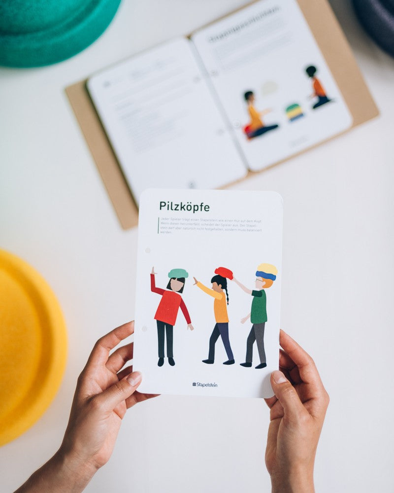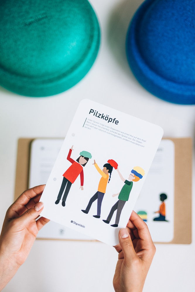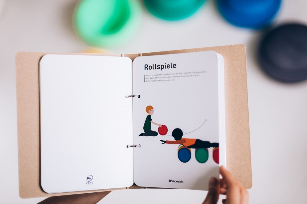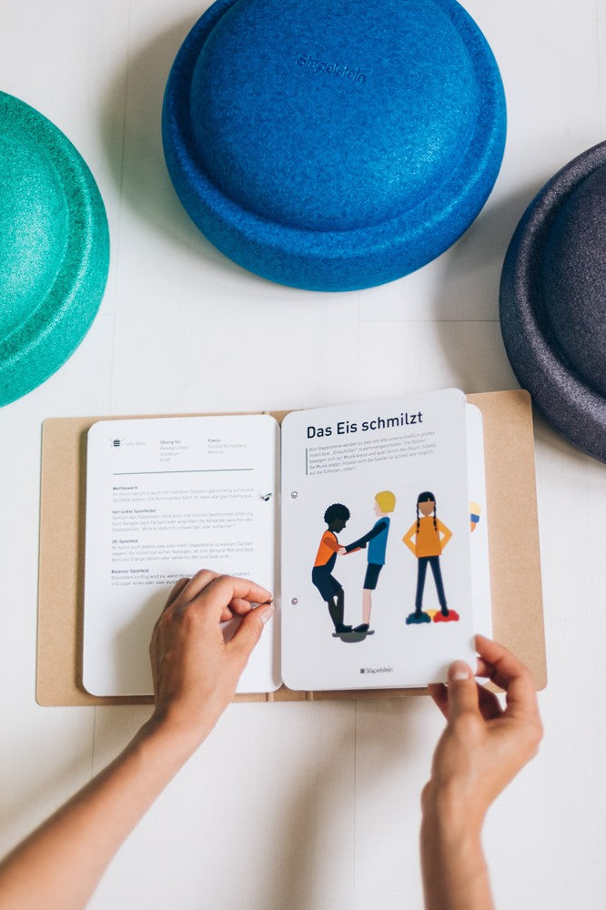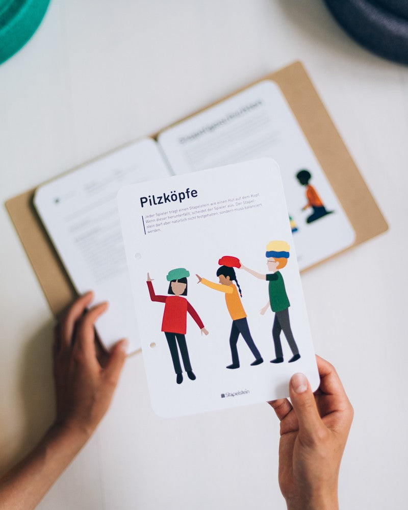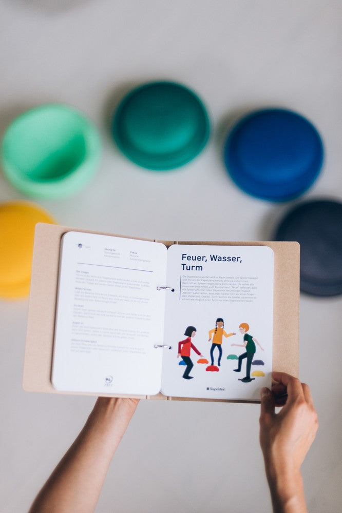 Stapelstein PLAY stellt elf Grundspiele, wie zum Beispiel Sortierspiele oder Balancespiele, mit den Stapelsteinen vor. Darauf aufbauend sind weitere elf konkrete Spielvorschläge, mit einer Vielzahl an Variationsmöglichkeiten enthalten. Die “Mein Spiel” Karte bietet genügend Platz um selbst kreativ zu werden und eigene Spielideen mit den Stapelsteinen zu entwickeln.