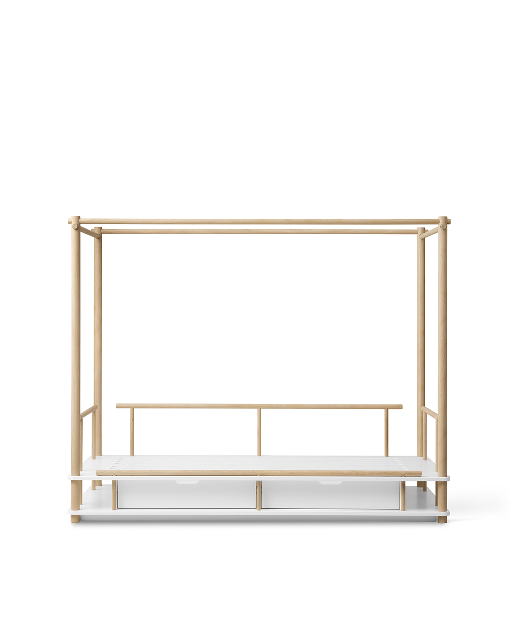 Der Rahmen aus hochwertiger, weiß geölter Eiche überzeugt durch versteckte Schrauben und bietet mit seinen geräumigen Schubladen darunter viel Stauraum. Besonders schön wird das Bett mit einem der vier passenden Himmel, die für eine gemütliche und fantasievolle Atmosphäre sorgen – ideal zum Träumen und Spielen.