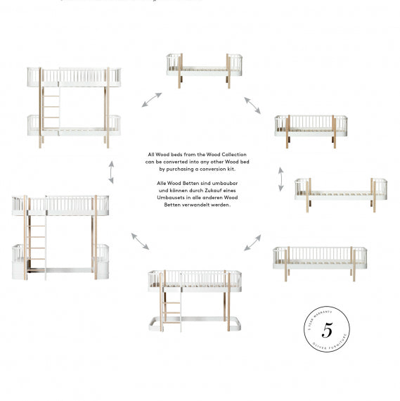 Alle Wood Betten können durch den Kauf eines Umbausatzes mit zusätzlichen Teilen in jedes andere Wood Bett umgewandelt werden (gilt nicht für Wood Baby- und Kinderbett, Wood Lounger sowie Wood Mini+).