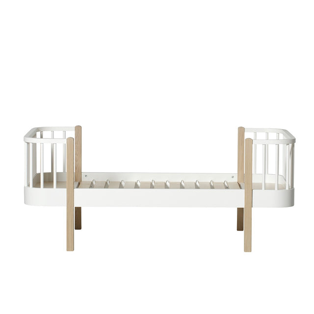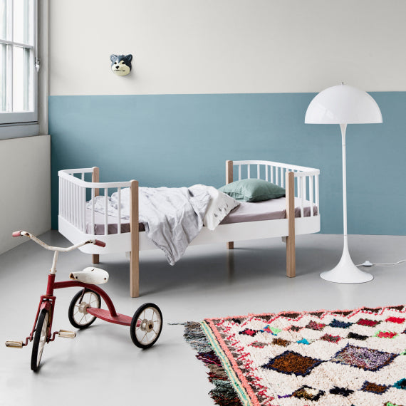 Das Wood Juniorbett mit einer Länge von 160 cm, abgerundeten Ecken und Elementen aus warmer, nordischer Eiche ist der perfekte Ort, um für das kleine Kind eine sichere und gemütliche Atmosphäre zu schaffen.
