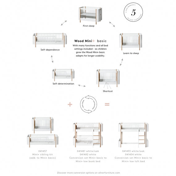 Wood Mini+ Babybett inkl. Umbauset Juniorbett von Oliver Furniture ist das ultimative erste Bett, das den Schlafbedürfnissen Ihres Kindes vom Säuglingsalter bis zum neunten Lebensjahr gerecht wird.