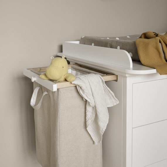 Die Seiten der Seaside Kommode und Wickelkommode von Oliver Furniture, können mit 2 zusätzlichen Auszügen ausgestattet werden, die unter der Wickelplatte integriert werden können: Auf der einen Seite hat der Auszug sechs Sprossen, an denen Dinge aufgehängt oder angebracht werden können, auf der anderen Seite ist er als Halterung für den mitgelieferten Wäschesack vorgesehen. Der Wäschesack ist aus 100% Baumwolle und Oeko-Tex-zertifiziert. Die funktionalen und durchdachten Lösungen der Kommode machen das Wickeln einfach und bequem, sodass das Kind im Mittelpunkt steht.