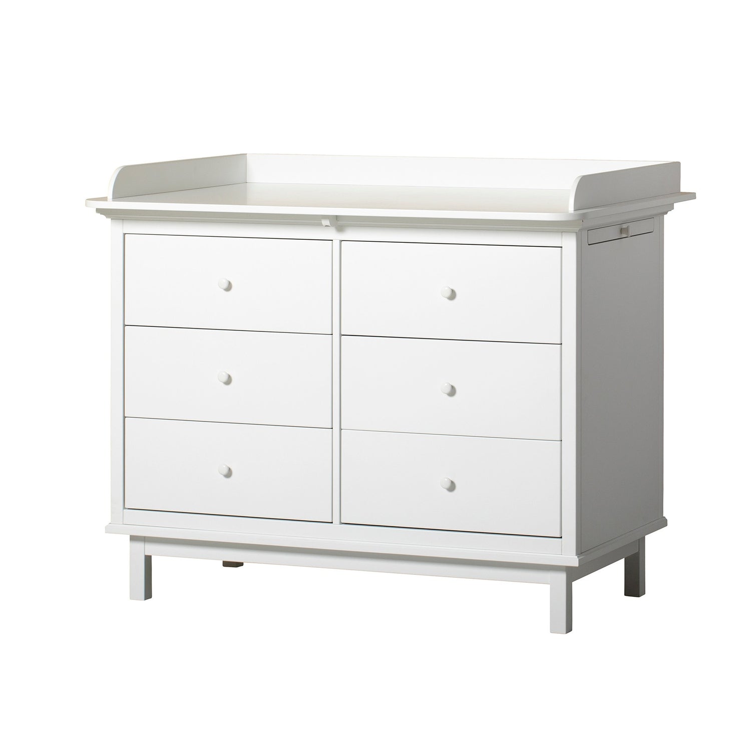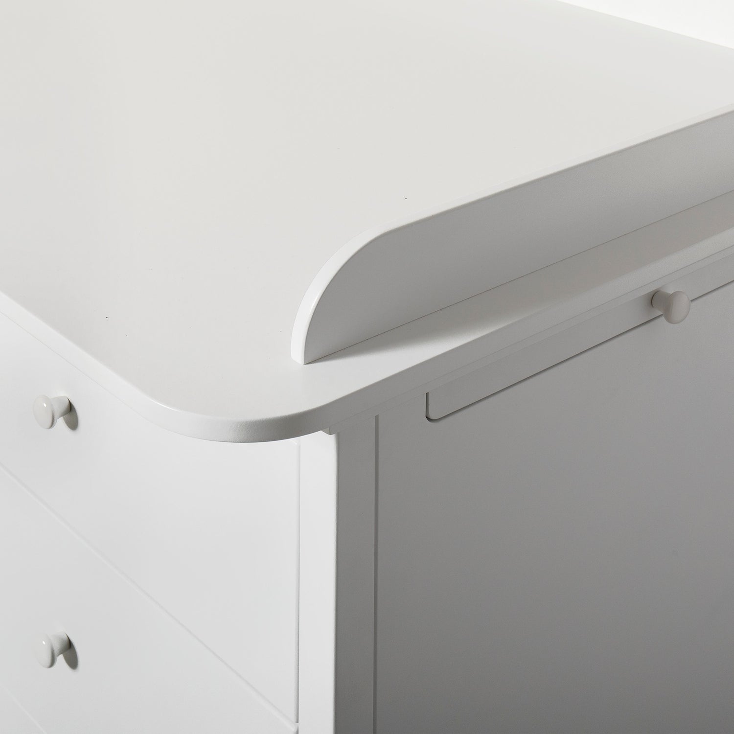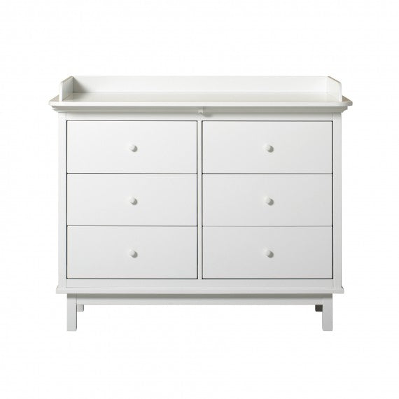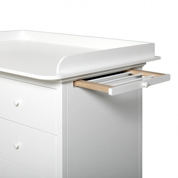 Die Seaside Wickelkommode von Oliver Furniture, vereint auf wundervolle Weise Wickelfunktion und Stauraum. Die sechs geräumigen Schubladen bieten ausreichend Platz für Windeln und saubere Kleidung – dadurch haben Sie immer alles zur Hand und müssen Ihrem Baby nie den Rücken zukehren. Die abgerundeten Kanten der Wickelplatte und deren großzügige Abmessungen schaffen eine angenehme Umgebung beim Wickeln – mit viel Platz für Bewegung und Spiel sowie dem wichtigen engen Kontakt zwischen Baby und Eltern. Das zeitlose Design, die hochwertige Verarbeitung und Details wie die Porzellangriffe an der Vorderseite der Schubladen machen die Seaside Wickelkommode zu einem Evergreen im Kinderzimmer. Die 6 soliden und geräumigen Schubladen laufen mühelos auf hochwertigen Schienen und eine spezielle Soft-Close-Funktion dämpft das Schließen der Schubladen. Das klassische Aussehen macht es einfach die Kommode mit Möbeln und Objekten anderer Stile zu kombinieren. Die Seiten der Wickelkommode können mit 2 zusätzlichen Auszügen ausgestattet werden, die unter der Topplatte integriert werden können: Ein Auszug hat sechs Sprossen, an denen Dinge aufgehängt oder angebracht werden können (10 Wäscheklammern inklusive), der andere ist er als Halterung für den zugehörigen Wäschesack vorgesehen (Artikel: 021330). Wenn die Wickelplatte nicht mehr benötigt wird, lässt sie sich leicht entfernen – und verwandelt das Möbelstück in eine zeitlose Kommode, die noch viele Jahre Freude bereitet. Dies ist ein Aspekt der Grundphilosophie von Oliver Furniture: Qualitativ hochwertige Möbel sind eine Investition fürs Leben. Abmessung: 117 x 76,5 x 97 cm (B/T/H)