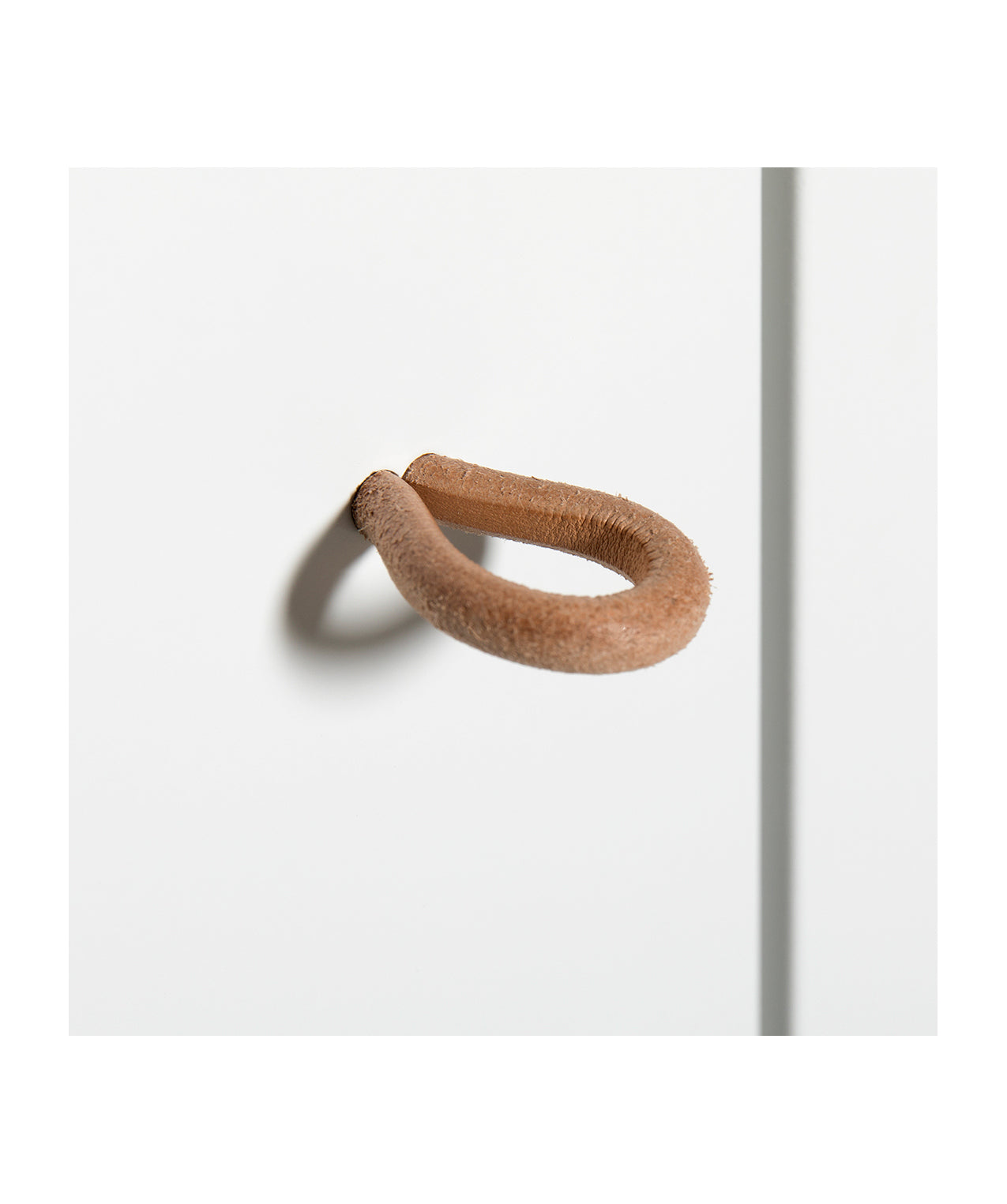 Die zwei runden Haken und der Sockel der Kommode aus massiver Eiche und die handgearbeiteten Ledergriffe unterstreichen die hohe handwerkliche Qualität der Möbel.