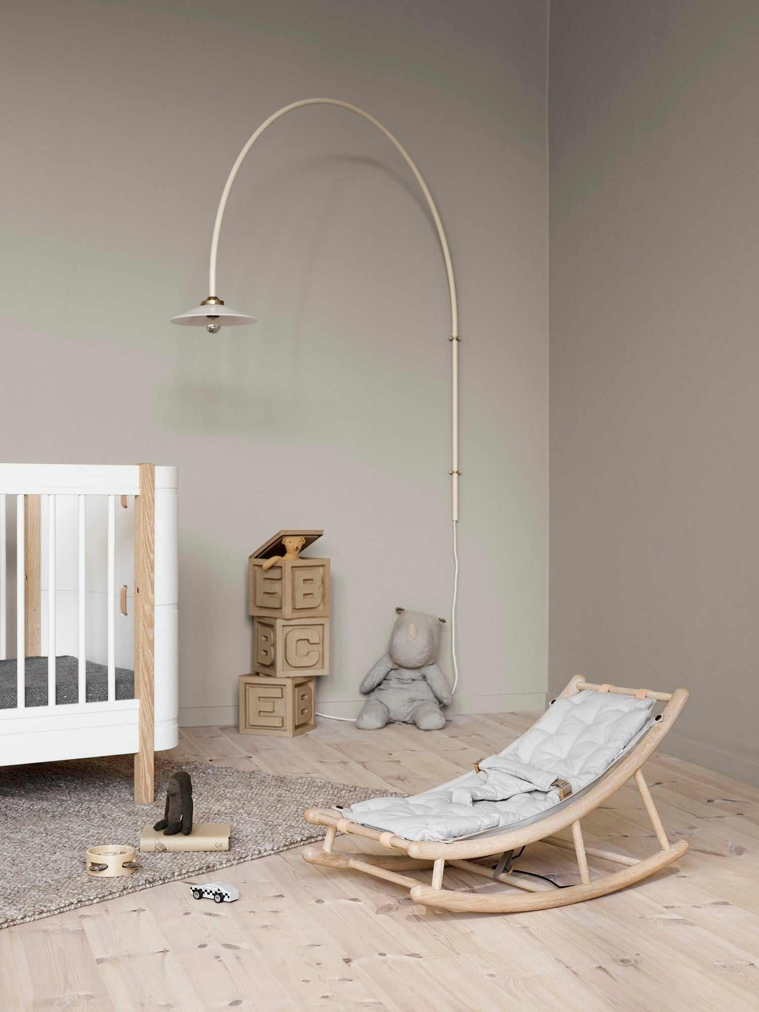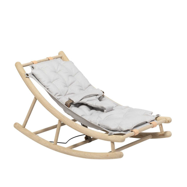 Der Rahmen ist aus massiver, weiß geölter Eiche hergestellt. Die Bezüge in schlichten Naturtönen verleihen der Wippe eine visuelle Leichtigkeit und passen somit zu jedem Einrichtung Stil.