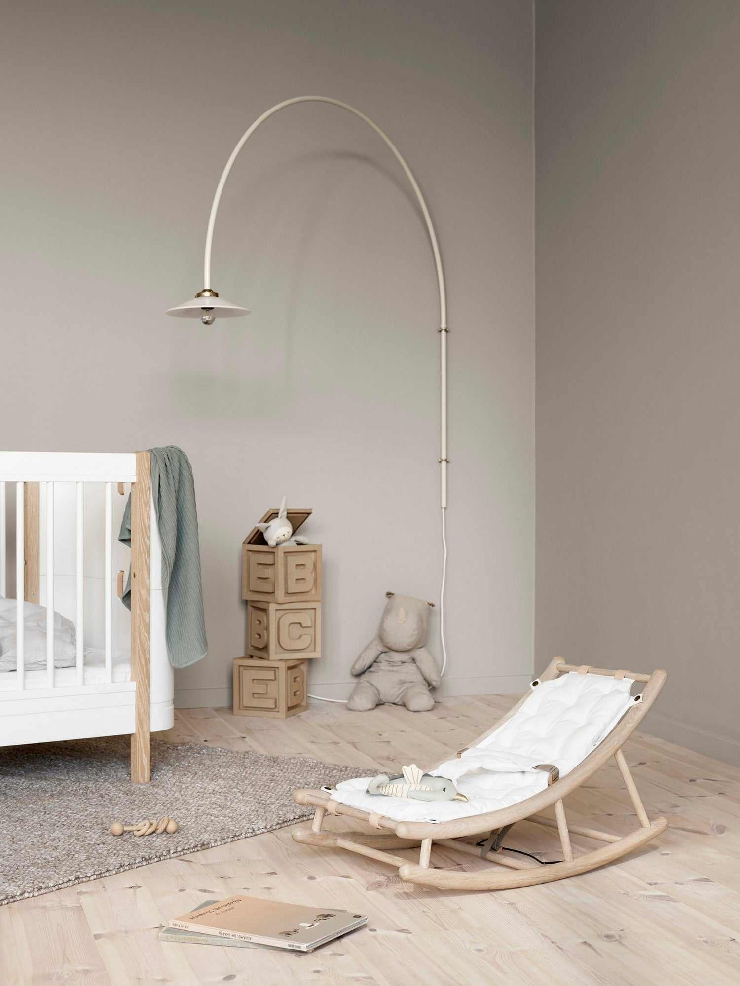 Der Rahmen ist aus massiver, weiß geölter Eiche hergestellt. Die Bezüge in schlichten Naturtönen verleihen der Wippe eine visuelle Leichtigkeit und passen somit zu jedem Einrichtung Stil.
