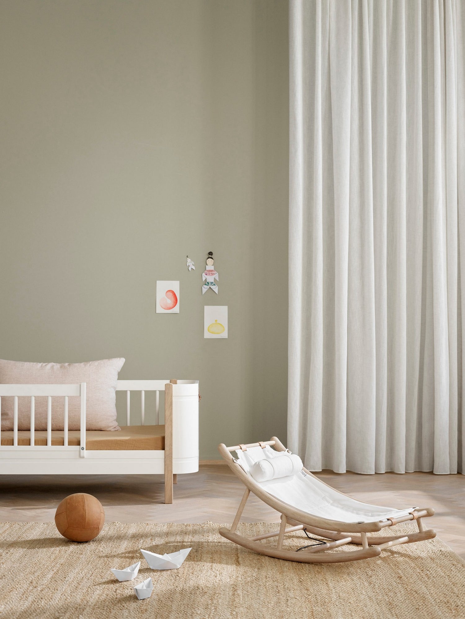 Der Rahmen ist aus massiver, weiß geölter Eiche hergestellt. Die Bezüge in schlichten Naturtönen verleihen der Wippe eine visuelle Leichtigkeit und passen somit zu jedem Einrichtung Stil.