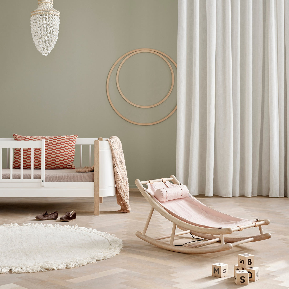 Der Rahmen ist aus massiver, weiß geölter Eiche hergestellt. Die Bezüge in schlichten Naturtönen verleihen der Wippe eine visuelle Leichtigkeit und passen somit zu jedem Einrichtung Stil.