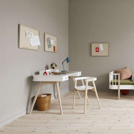 Der Wood Armlehnstuhl ist eine ideale Ergänzung zum Wood Schreibtisch, kann aber in seiner Einfachheit auch allein stehen oder mit der bereits vorhandenen Einrichtung kombiniert werden. Wood Armlehnstuhl ist in zwei Höhen verstellbar und zeichnet sich, wie die anderen Möbel von Oliver Furnitures Wood Collection, durch sein durchdachtes Design aus. Die runde Rückenlehne und die hochwertige Verarbeitung des Stuhls sorgen für optische Leichtigkeit, während Details wie die leicht schräg gestellten Beine die hohe handwerkliche Qualität zum Ausdruck bringen. Der stabile Stuhl aus weiß lackierter Birke und weiß geöltem Eichenfurnier ist, in seinem schlichten und zugleich leicht nostalgischen Design, die Basis für gute Gespräche und konzentriertes Alleinsein für Groß und Klein.