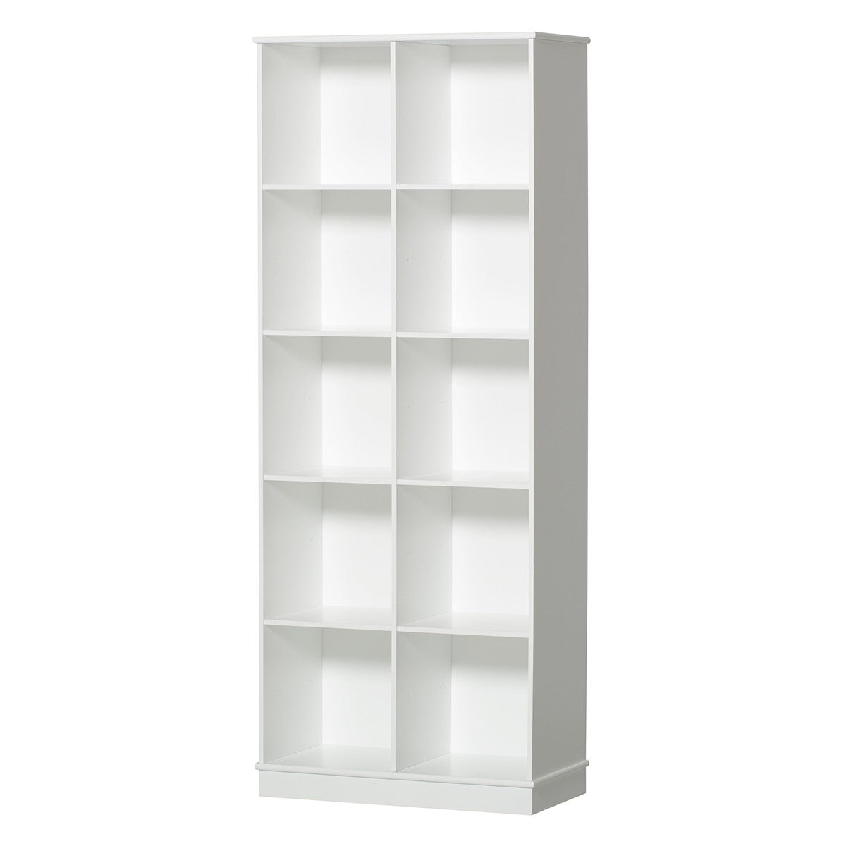 Ein hohes Regal von Oliver Furniture, im klassisch nordischen Stil. Das Regal hat 10 Fächer – 2 nebeneinander und 5 untereinander und steht auf einem Sockel.