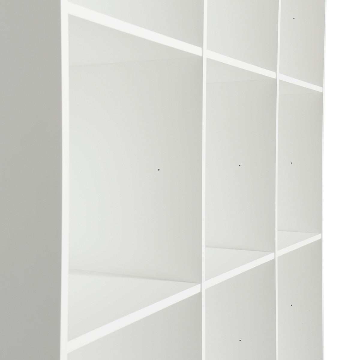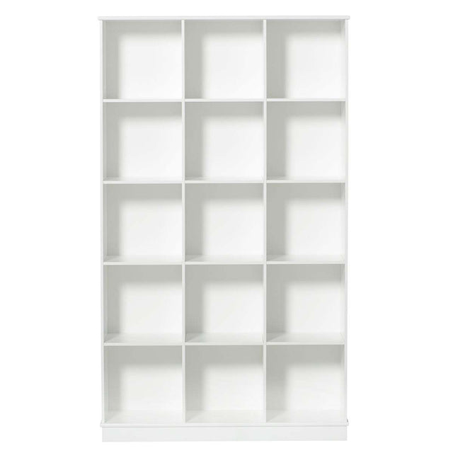 Dieses Kastenregal von Oliver Furniture, steht auf einen Sockel und hat 15 Fächer – 3 waagerecht und 5 senkrecht übereinander.