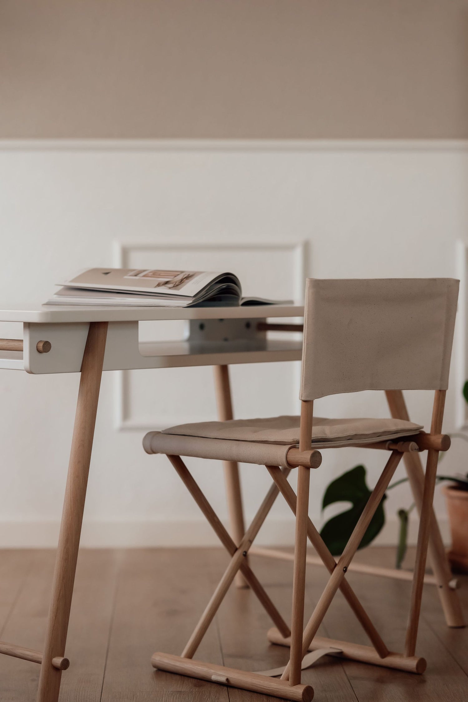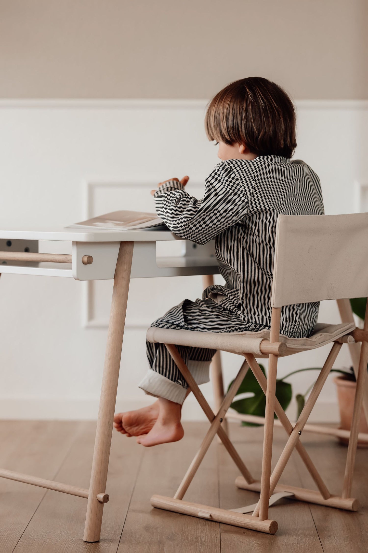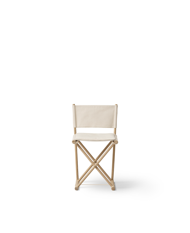 Der Camp Juniorstuhl von Oliver Furniture ist von klassischen Feld- oder Regiestühlen inspiriert und besteht aus einem stabilen Eichenrahmen sowie einem Sitz und einer Rückenlehne aus schwerem, ungefärbtem Canvas.