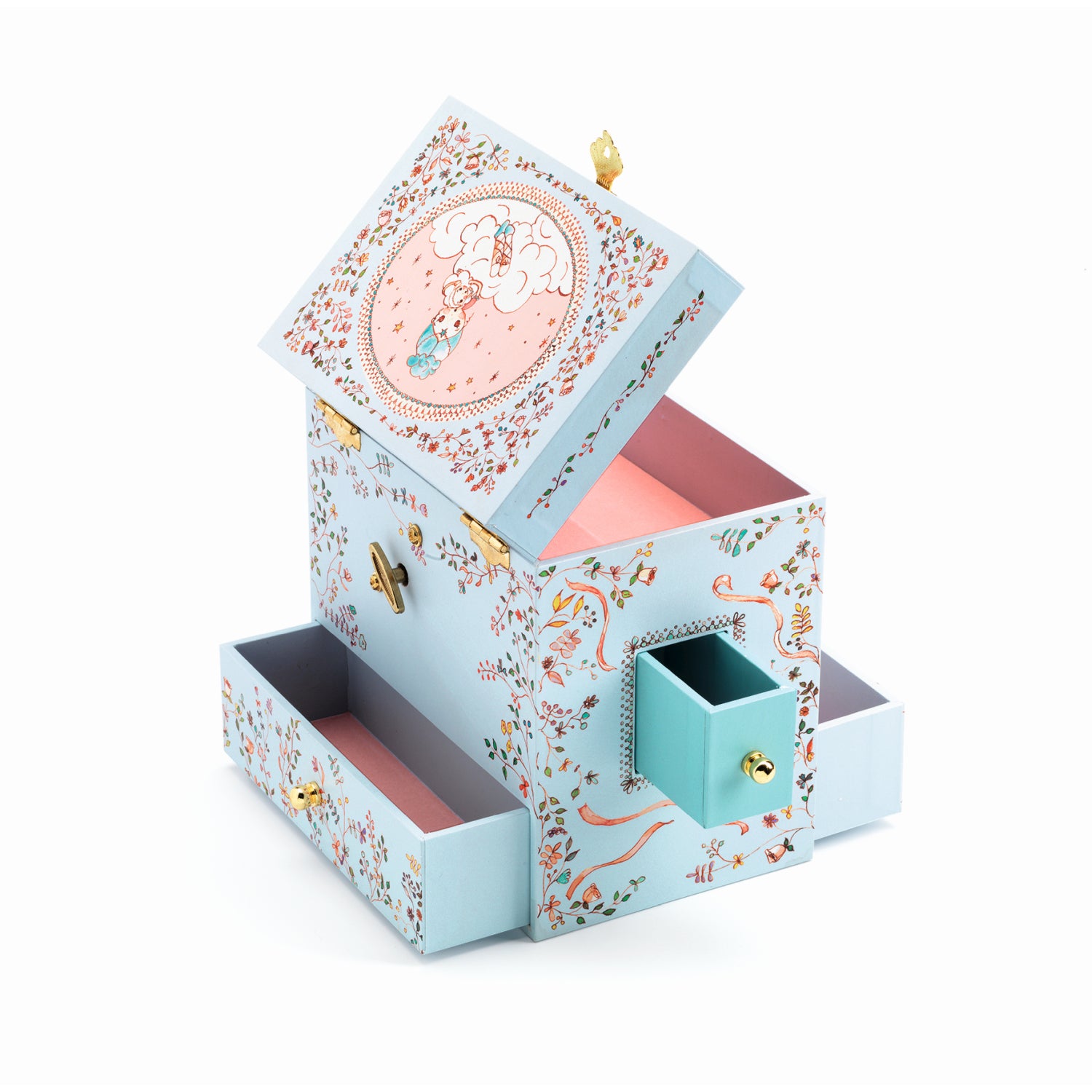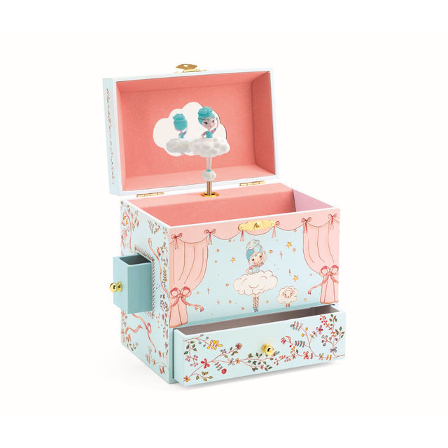 Zauberhaftes Schmuckkästchen „Ballerina“ DJ06591 mit Spieluhr von Djeco, 15 x 10 x 15 cm mit verschiedenen Schubladen um tolle Schätze aufzubewahren. Beim Aufklappen ertönt eine zarte Musik. Für kleine Musikliebhaber ab 4 Jahren