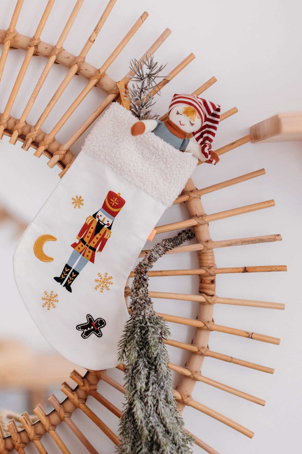 Der Stiefel hat eine Schlaufe zum Aufhängen und ist mit einem Nussknacker liebevoll bestickt.