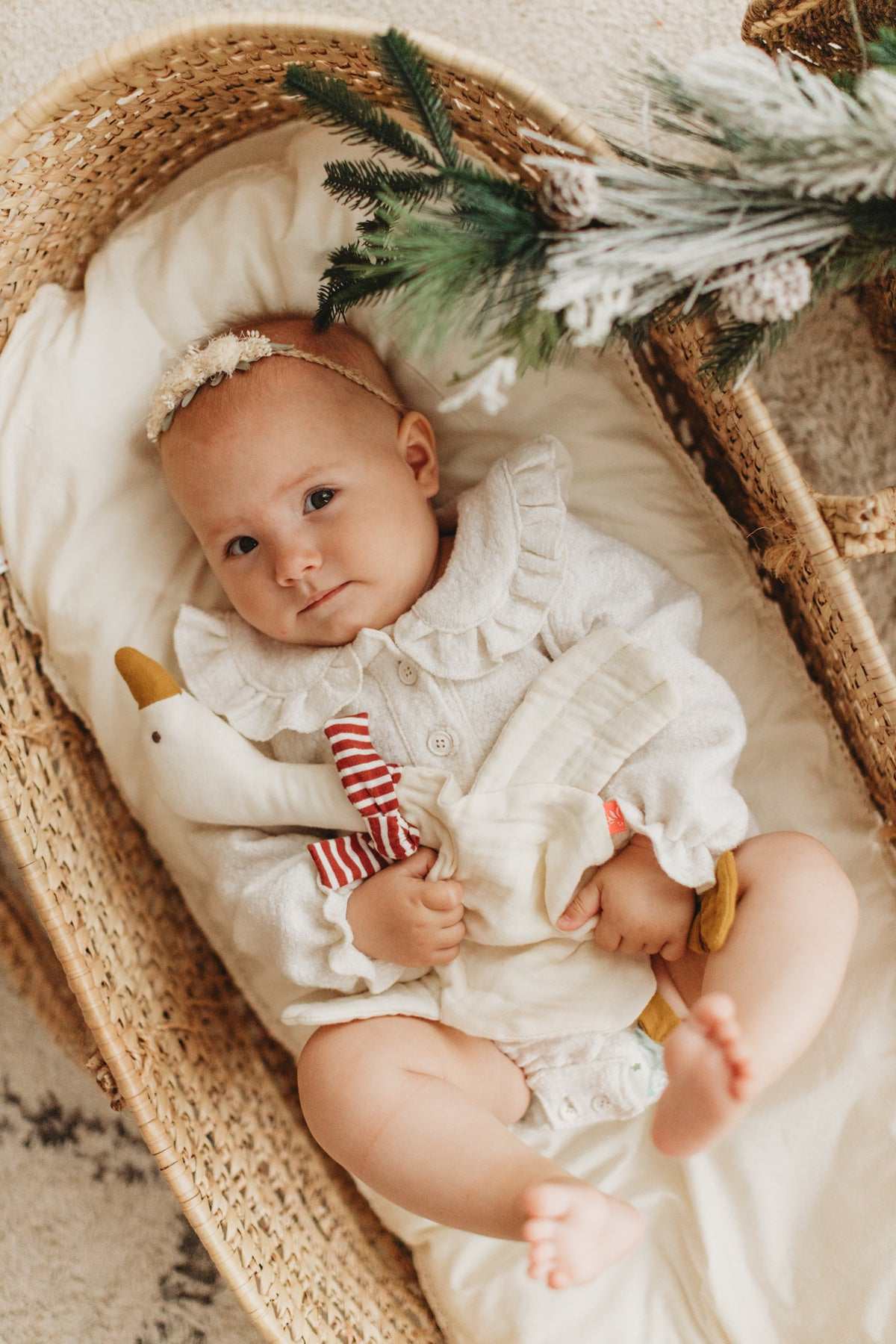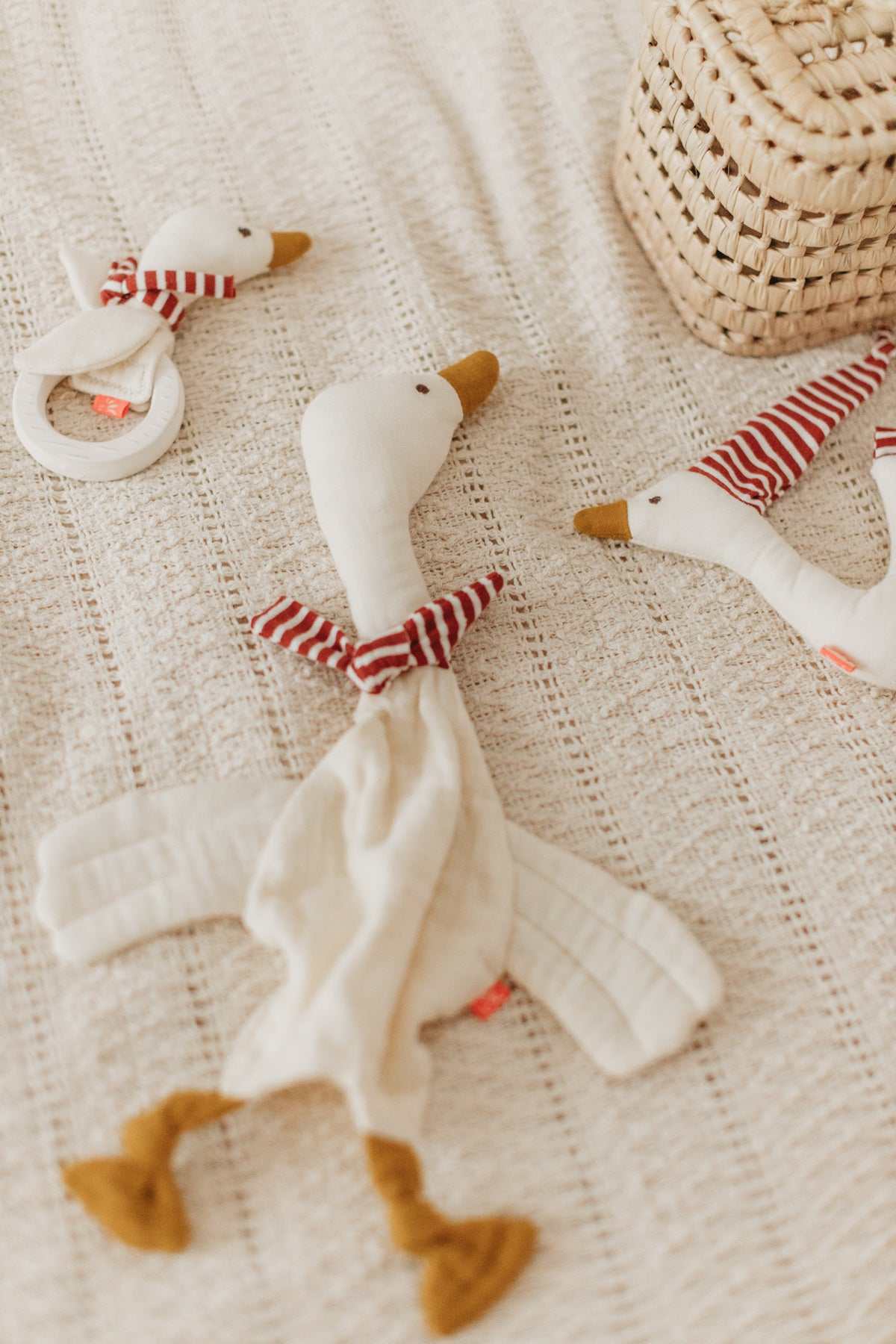Das schlichte Schmusetuch im entzückenden Gans-Design von Kikadu ist aus besonders weichem Musselin aus Bio-Baumwolle hergestellt und wurde nach den höchsten Standards von GOTS zertifiziert.