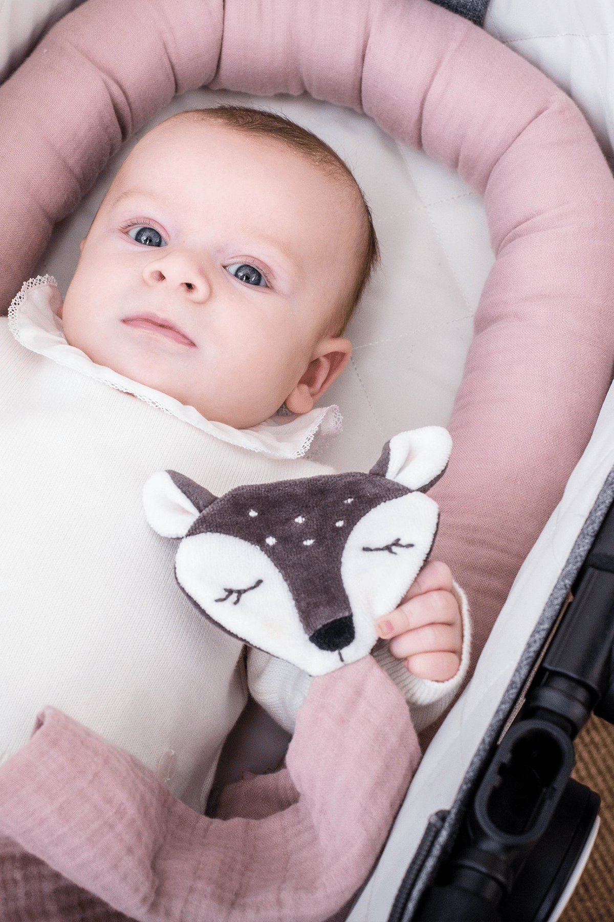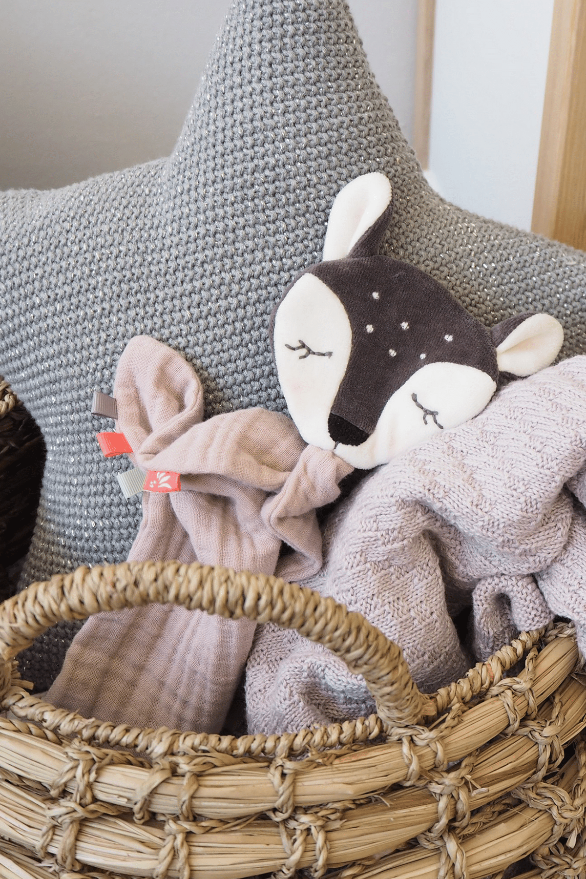 Das Schmusetuch von Kikadu, ist durch sein natürliches Design mit verspielten Details, wie etwa dem niedlichen Rehkitz- Kopf, ein toller Freund für jedes Kind.