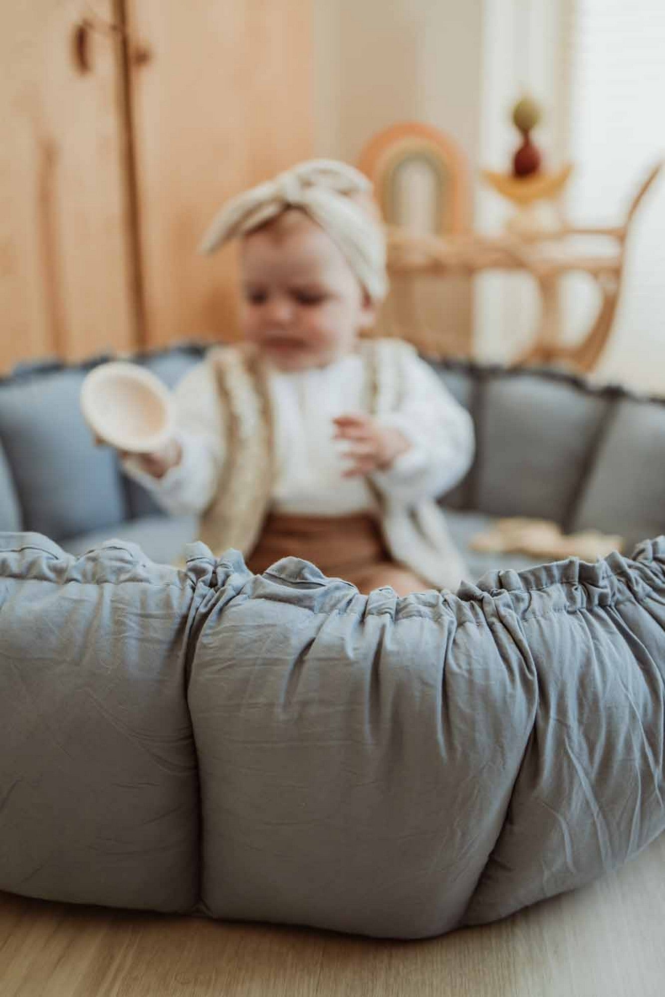 Was tun, wenn Ihr kleiner Wirbelwind einen sicheren Spielplatz, ein gemütliches Nest und gleichzeitig eine praktische Aufbewahrung braucht? Die Play&Go Bloom Babymatte macht’s möglich – und das gleich dreifach! Flach ausgebreitet bietet sie eine weiche, gepolsterte Fläche aus GOTS-zertifizierter Bio-Baumwolle, auf der Babys nach Herzenslust spielen, krabbeln oder entspannen können. Und wenn die kleine Pause kommt, verwandelt sich die Matte im Nu in ein kuscheliges Nest mit erhöhtem Rand – ideal für ein sicheres, behütetes Liegen auf dem Bauch.