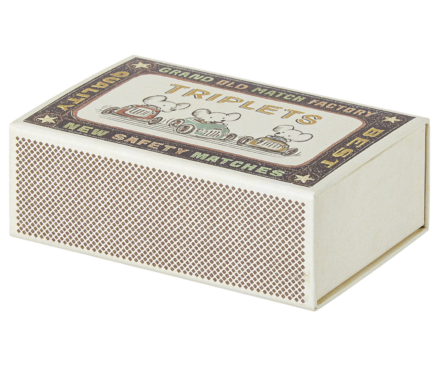 Die Maileg Drillinge, Babymäuse in der Streichholzschachtel sind ein klassischer Artikel, der es ermöglicht, gleich drei süße Babymäuse auf einmal zu haben. Die kleinen Mäuse können vorsichtig in ihrem Streichholzschachtelbett untergebracht werden, wo sie in einem warmen Schlafsack schlafen können. Diese niedlichen Mäuse passen perfekt zu allen anderen Zubehören in Babymausgröße.