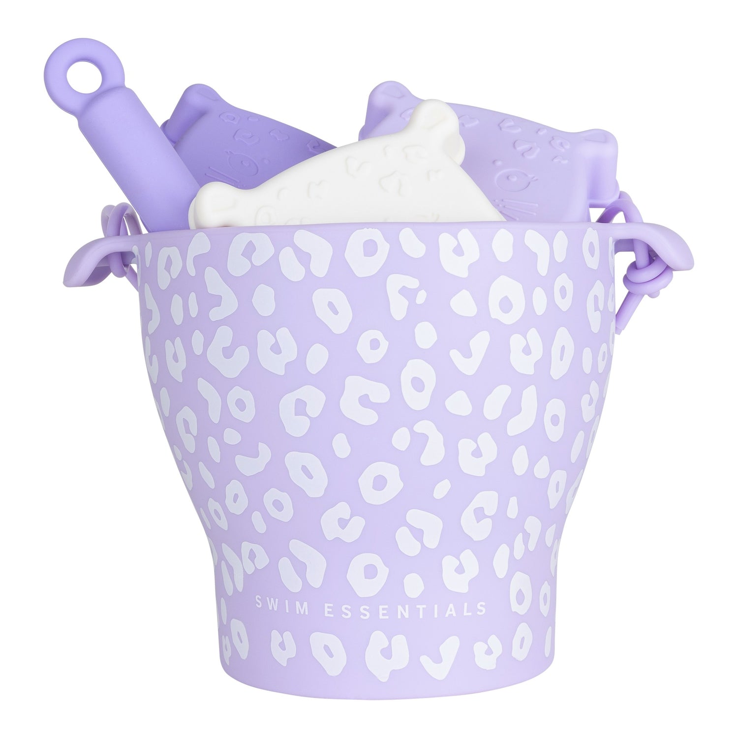 Erleben Sie stundenlangen Strandspaß mit dem robusten Eimer, der fröhlichen Schaufel und drei verspielten Förmchen im Lila-Leoparden-Design von Swim Essentials.