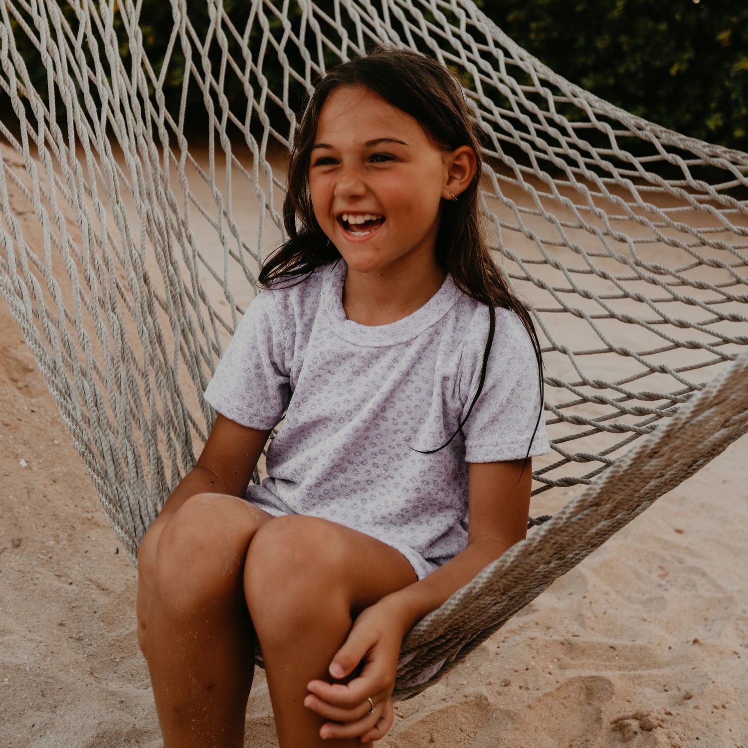 Das leichte und luftige Design von T-Shirt und Shorts ermöglicht Ihrer Kleinen Bewegungsfreiheit und Komfort. Dieses süße Strand-Set verleiht Ihrer Kleinen nicht nur Stil für die Sommertage, sondern bietet auch Komfort und Bequemlichkeit. Lassen Sie Ihre Kleine den Strand in diesem unwiderstehlichen lila Leoparden-Jumpsuit-Set genießen!