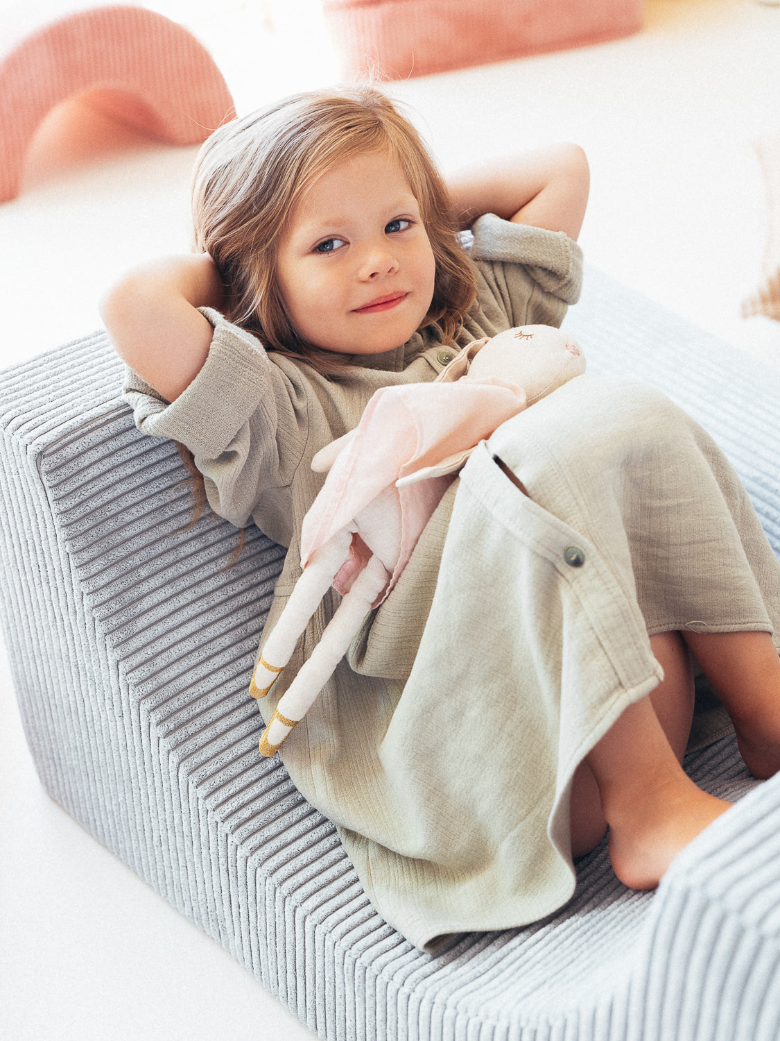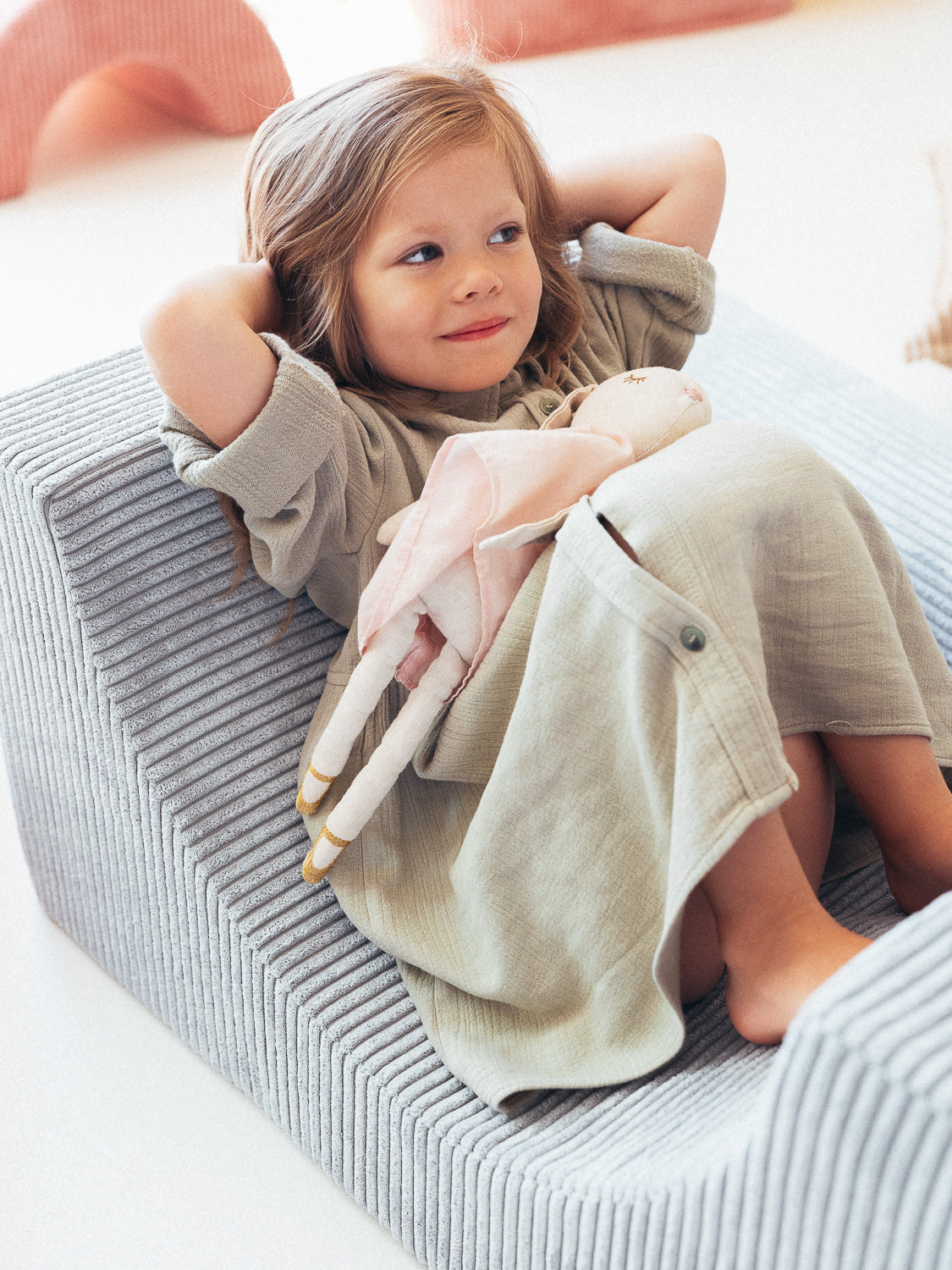 Das Spiel- Set wird in Lettland lokal hergestellt, wobei besonderer Wert auf die Nachhaltigkeit gelegt wird. Der Cord- Stoff aus recycelten PET-Flaschen ist zertifiziert und unterstreicht das Engagement von Wigiwama für Umweltschutz.