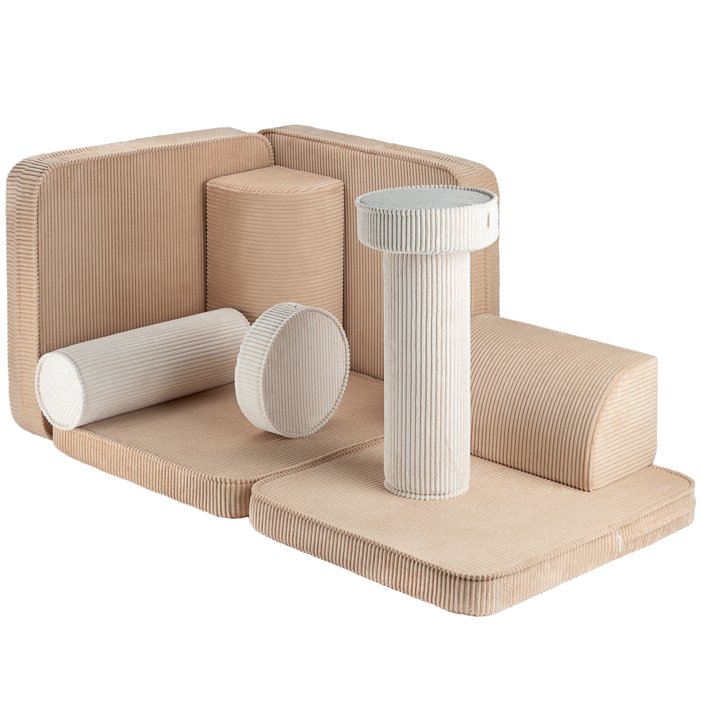 Das Sofa besteht aus insgesamt 9 Teilen, darunter zwei Sitzkissen, ein großes Sitzkissen, zwei Dreieckskissen als Rückenlehnen, zwei Rollenkissen als Armlehnen und zwei runde Kissen. Diese Kombination bietet unbegrenzte Möglichkeiten für fantasievolles Spielen und sorgt für stundenlangen Spaß.